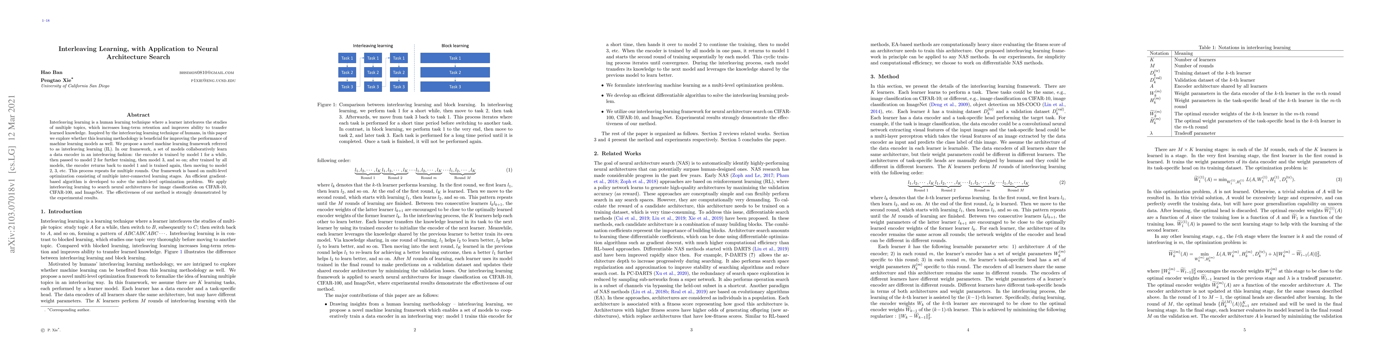 Interleaving learning is a human learning technique where a learner interleaves the studies of multiple topics, which increases long-term retention and improves ability to transfer learned knowledge. Inspired by the interleaving learning technique of humans, in this paper we explore whether this learning methodology is beneficial for improving the performance of machine learning models as well. We propose a novel machine learning framework referred to as interleaving learning (IL). In our framework, a set of models collaboratively learn a data encoder in an interleaving fashion: the encoder is trained by model 1 for a while, then passed to model 2 for further training, then model 3, and so on; after trained by all models, the encoder returns back to model 1 and is trained again, then moving to model 2, 3, etc. This process repeats for multiple rounds. Our framework is based on multi-level optimization consisting of multiple inter-connected learning stages. An efficient gradient-based algorithm is developed to solve the multi-level optimization problem. We apply interleaving learning to search neural architectures for image classification on CIFAR-10, CIFAR-100, and ImageNet. The effectiveness of our method is strongly demonstrated by the experimental results.