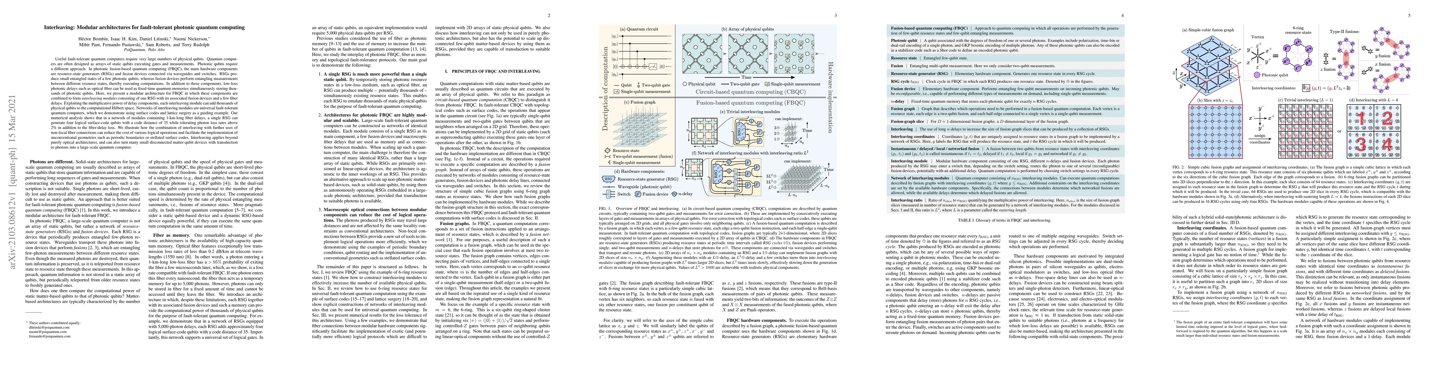 Useful fault-tolerant quantum computers require very large numbers of physical qubits. Quantum computers are often designed as arrays of static qubits executing gates and measurements. Photonic qubits require a different approach. In photonic fusion-based quantum computing (FBQC), the main hardware components are resource-state generators (RSGs) and fusion devices connected via waveguides and switches. RSGs produce small entangled states of a few photonic qubits, whereas fusion devices perform entangling measurements between different resource states, thereby executing computations. In addition, low-loss photonic delays such as optical fiber can be used as fixed-time quantum memories simultaneously storing thousands of photonic qubits. Here, we present a modular architecture for FBQC in which these components are combined to form "interleaving modules" consisting of one RSG with its associated fusion devices and a few fiber delays. Exploiting the multiplicative power of delays, each module can add thousands of physical qubits to the computational Hilbert space. Networks of modules are universal fault-tolerant quantum computers, which we demonstrate using surface codes and lattice surgery as a guiding example. Our numerical analysis shows that in a network of modules containing 1-km-long fiber delays, each RSG can generate four logical distance-35 surface-code qubits while tolerating photon loss rates above 2% in addition to the fiber-delay loss. We illustrate how the combination of interleaving with further uses of non-local fiber connections can reduce the cost of logical operations and facilitate the implementation of unconventional geometries such as periodic boundaries or stellated surface codes. Interleaving applies beyond purely optical architectures, and can also turn many small disconnected matter-qubit devices with transduction to photons into a large-scale quantum computer.