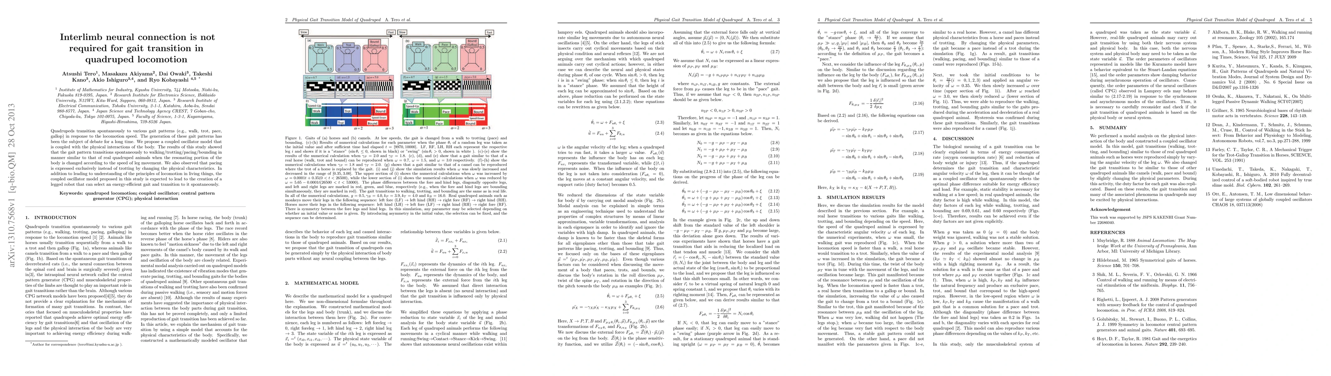 This study demonstrates that interlimb neural connections are not essential for gait transitions in quadruped locomotion, proposing a coupled oscillator model that mimics natural gait changes based on leg movement speed and physical body characteristics. The findings suggest the potential for developing energy-efficient legged robots.