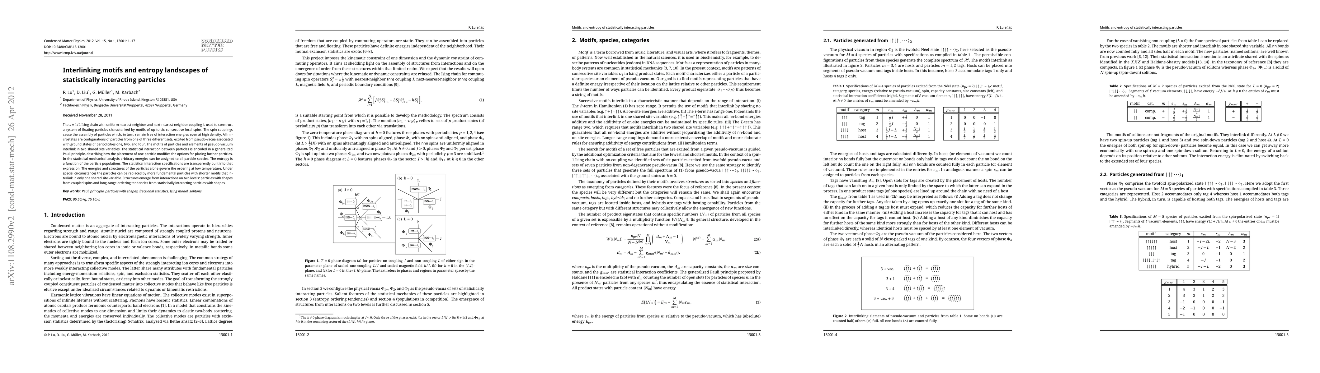 The s=1/2 Ising chain with uniform nearest-neighbor and next-nearest-neighbor coupling is used to construct a system of floating particles characterized by motifs of up to six consecutive local spins. The spin couplings cause the assembly of particles which, in turn, remain free of interaction energies even at high density. All microstates are configurations of particles from one of three different sets, excited from pseudo-vacua associated with ground states of periodicities one, two, and four. The motifs of particles and elements of pseudo-vacuum interlink in two shared site variables. The statistical interaction between particles is encoded in a generalized Pauli principle, describing how the placement of one particle modifies the options for placing further particles. In the statistical mechanical analysis arbitrary energies can be assigned to all particle species. The entropy is a function of the particle populations. The statistical interaction specifications are transparently built into that expression. The energies and structures of the particles alone govern the ordering at low temperature. Under special circumstances the particles can be replaced by more fundamental particles with shorter motifs that interlink in only one shared site variable. Structures emerge from interactions on two levels: particles with shapes from coupled spins and long-range ordering tendencies from statistically interacting particles with shapes.