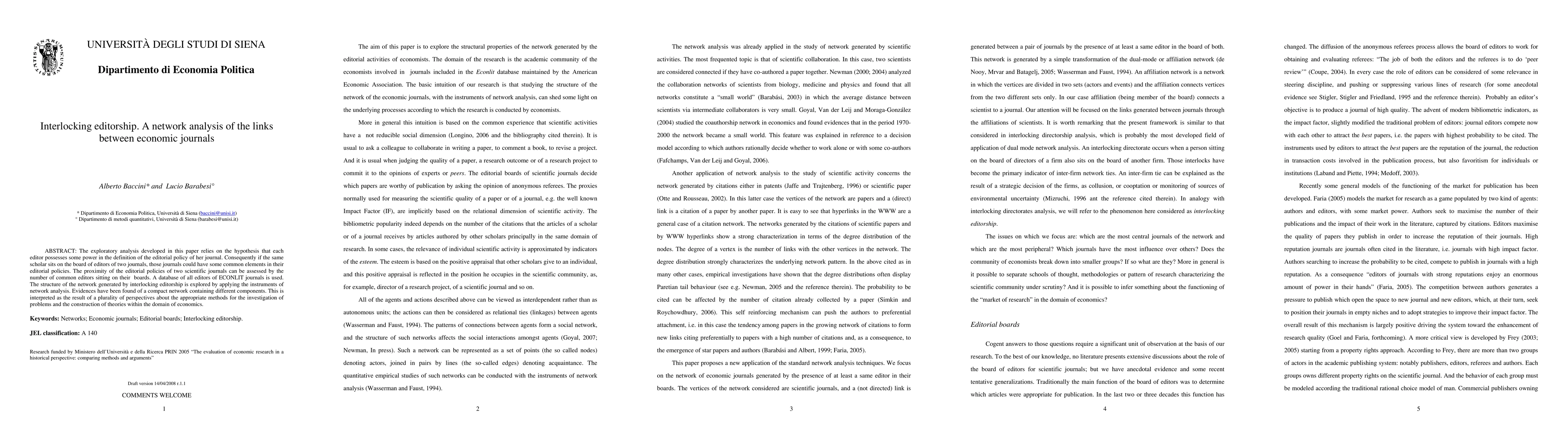 The exploratory analysis developed in this paper relies on the hypothesis that each editor possesses some power in the definition of the editorial policy of her journal. Consequently if the same scholar sits on the board of editors of two journals, those journals could have some common elements in their editorial policies. The proximity of the editorial policies of two scientific journals can be assessed by the number of common editors sitting on their boards. A database of all editors of ECONLIT journals is used. The structure of the network generated by interlocking editorship is explored by applying the instruments of network analysis. Evidences have been found of a compact network containing different components. This is interpreted as the result of a plurality of perspectives about the appropriate methods for the investigation of problems and the construction of theories within the domain of economics.