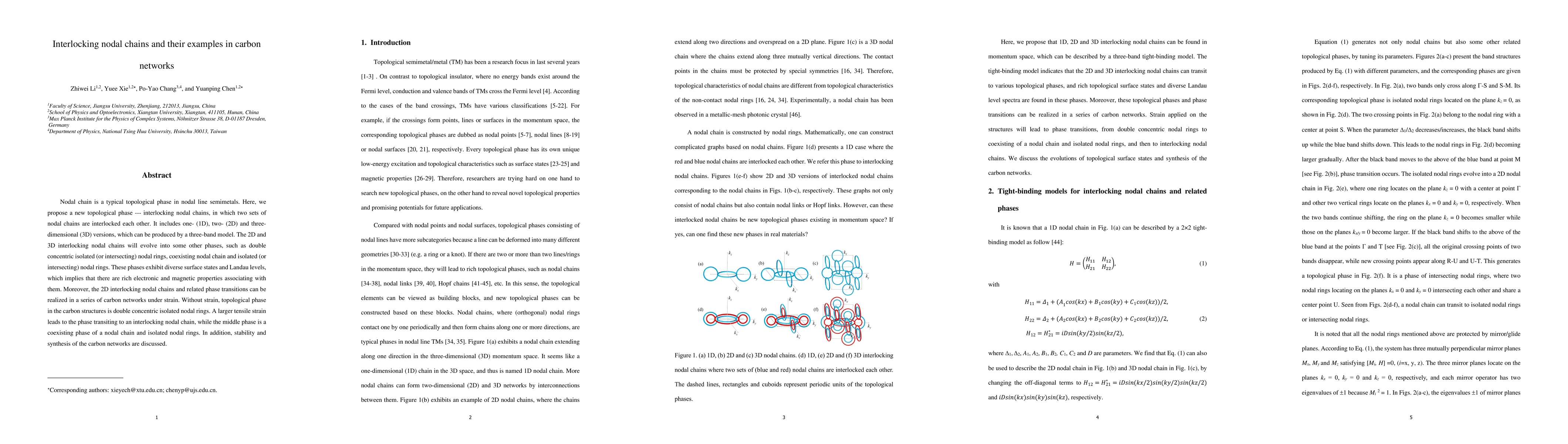 The paper presents a theoretical framework for understanding and identifying interlocking nodal chains in carbon networks, along with their phase transitions under strain, utilizing a three-band model and first-principles calculations.