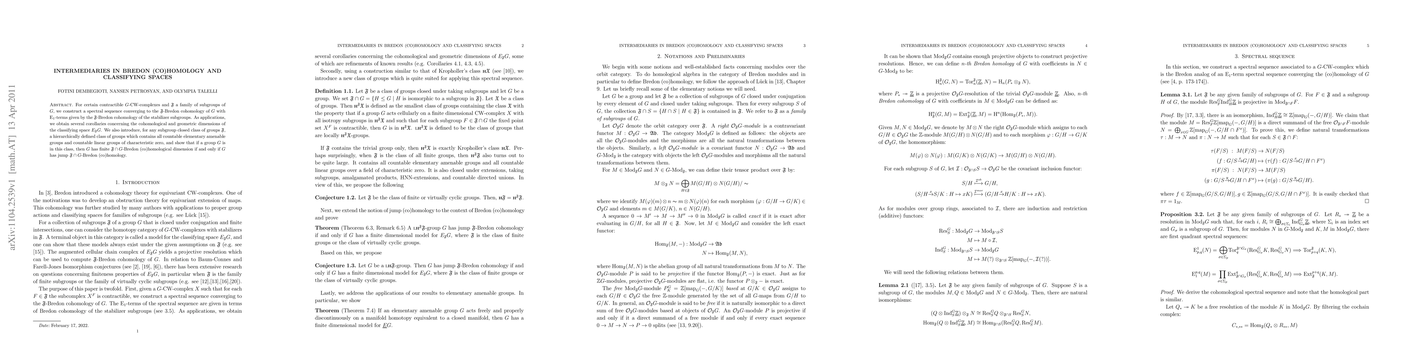 This paper constructs a spectral sequence for certain contractible G-CW-complexes, linking F-Bredon cohomology to stabilizer subgroups, and applies it to study the dimensions of classifying spaces. It also defines a class of groups encompassing countable amenable and linear groups, proving that group G in this class has finite Bredon (co)homological dimension if and only if it has jump Bredon (co)homology.