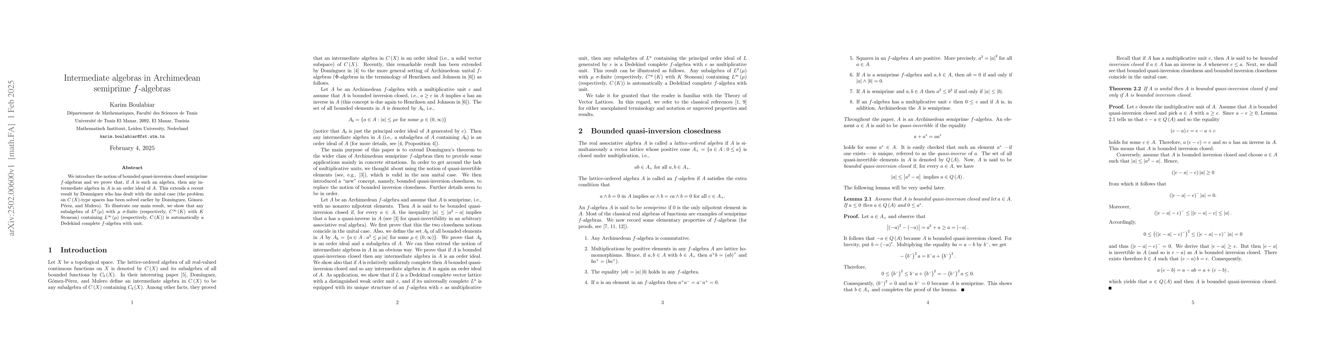 The paper introduces bounded quasi-inversion closed semiprime f-algebras and proves that intermediate algebras in such algebras are order ideals, extending previous results on unital cases.