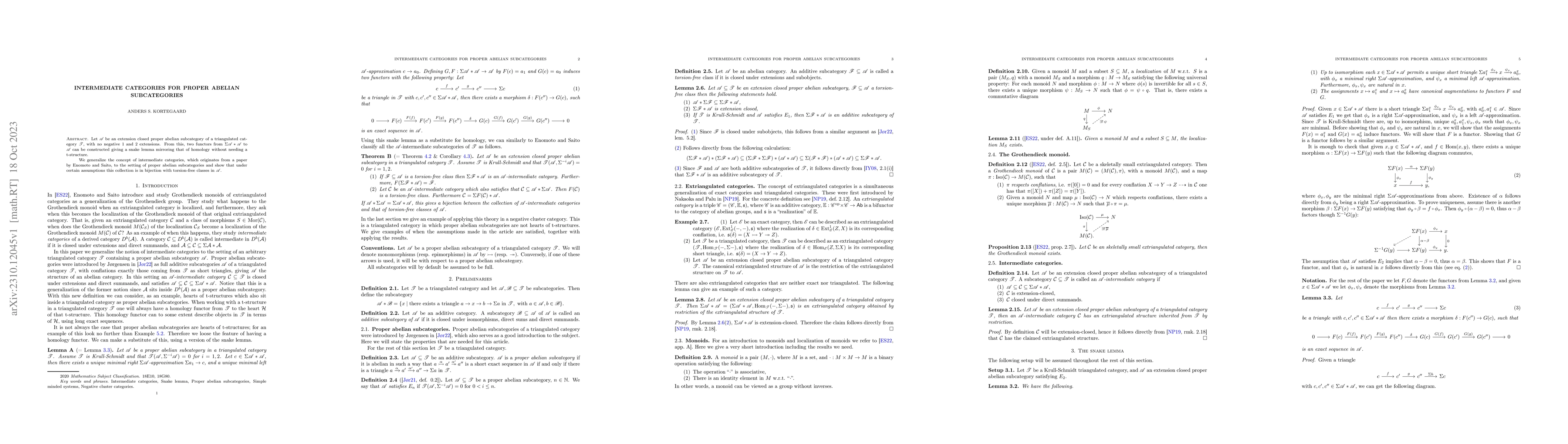 Let $\mathscr{A}$ be an extension closed proper abelian subcategory of a triangulated category $\mathscr{T}$, with no negative 1 and 2 extensions. From this, two functors from $\Sigma\mathscr{A}\ast\mathscr{A}$ to $\mathscr{A}$ can be constructed giving a snake lemma mirroring that of homology without needing a t-structure. We generalize the concept of intermediate categories, which originates from a paper by Enomoto and Saito, to the setting of proper abelian subcategories and show that under certain assumptions this collection is in bijection with torsion-free classes in $\mathscr{A}$.
