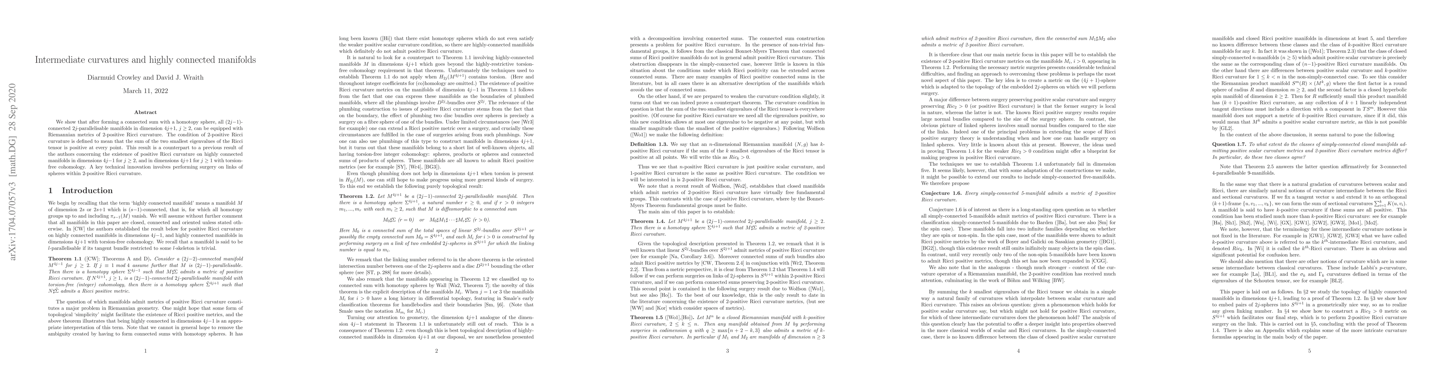 We show that after forming a connected sum with a homotopy sphere, all (2j-1)-connected 2j-parallelisable manifolds in dimension 4j+1, j > 0, can be equipped with Riemannian metrics of 2-positive Ricci curvature. The condition of 2-positive Ricci curvature is defined to mean that the sum of the two smallest eigenvalues of the Ricci tensor is positive at every point. This result is a counterpart to a previous result of the authors concerning the existence of positive Ricci curvature on highly connected manifolds in dimensions 4j-1 for j > 1, and in dimensions 4j+1 for j > 0 with torsion-free cohomology.