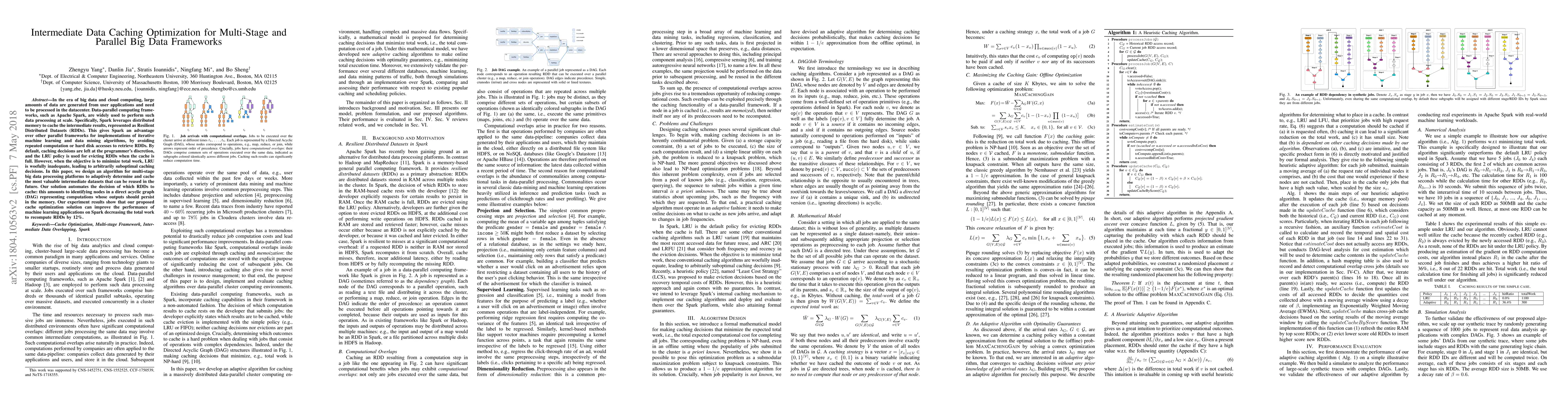 This paper proposes an algorithm for optimizing intermediate data caching in multi-stage big data frameworks like Apache Spark, aiming to minimize the total work by caching the most valuable datasets. Experimental results show a 12% reduction in recomputation work for machine learning applications.