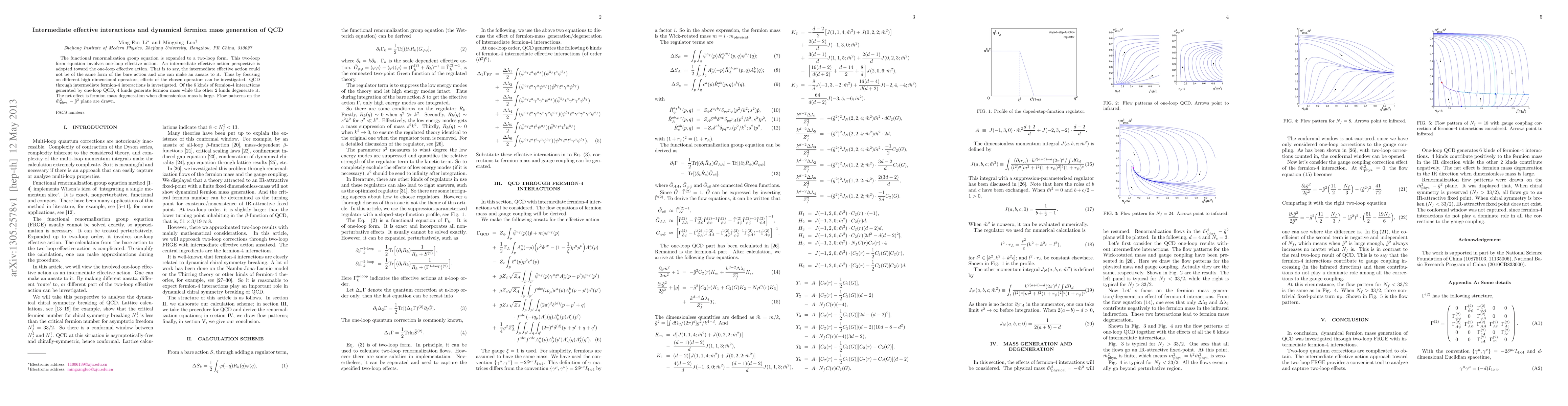 The functional renormalization group equation is expanded to a two-loop form. This two-loop form equation involves one-loop effective action. An intermediate effective action perspective is adopted toward the one-loop effective action. That is to say, the intermediate effective action could not be of the same form of the bare action and one can make an ansatz to it. Thus by focusing on different high dimensional operators, effects of the chosen operators can be investigated. QCD through intermediate fermion-4 interactions is investigated. Of the 6 kinds of fermion-4 interactions generated by one-loop QCD, 4 kinds generate fermion mass while the other 2 kinds degenerate it. The net effect is fermion mass degeneration when dimensionless mass is large. Flow patterns on the $\tilde{m}^2_{\text{phys.}}-\tilde{g}^2$ plane are drawn.