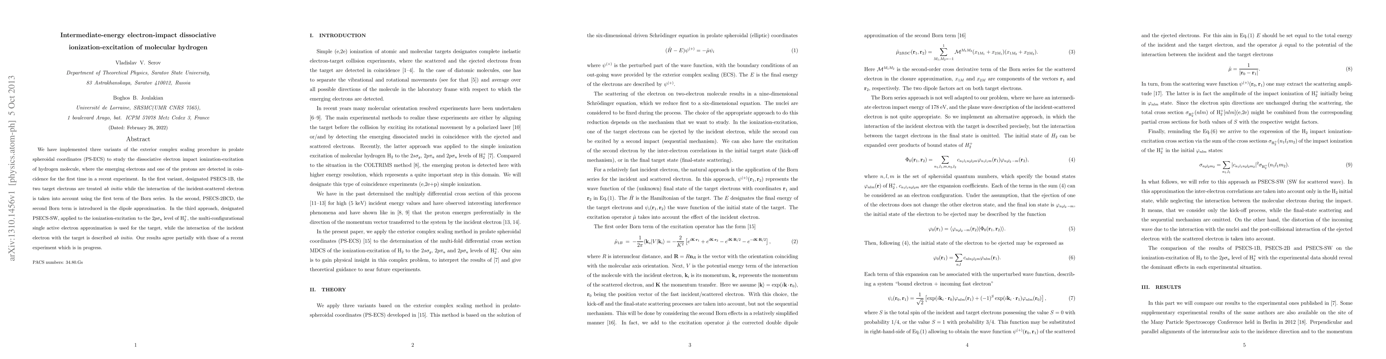 We have implemented three variants of the exterior complex scaling procedure in prolate spheroidal coordinates (PS-ECS) to study the dissociative electron impact ionization-excitation of hydrogen molecule, where the emerging electrons and one of the protons are detected in coincidence for the first time in a recent experiment. In the first variant, designated PSECS-1B, the two target electrons are treated ab initio while the interaction of the incident-scattered electron is taken into account using the first term of the Born series. In the second, PSECS-2BCD, the second Born term is introduced in the dipole approximation. In the third approach, designated PSECS-SW, applied to the ionization-excitation to the $2p\sigma_u$ level of H$_2^+$, the multi-configurational single active electron approximation is used for the target, while the interaction of the incident electron with the target is described ab initio. Our results agree partially with those of a recent experiment which is in progress.