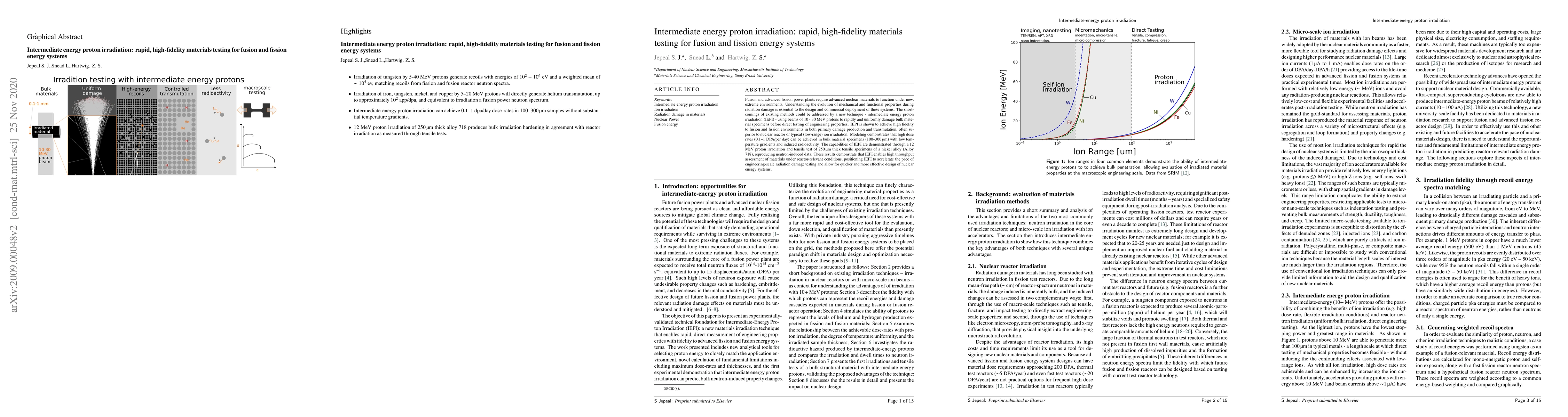 Intermediate energy proton irradiation (IEPI) offers a rapid, high-fidelity method for testing nuclear materials under fusion and fission conditions, achieving high dose rates and mimicking radiation environments better than traditional methods. IEPI's demonstrated effectiveness in tensile testing of nickel alloy specimens suggests it can accelerate material assessment and design for advanced nuclear energy systems.