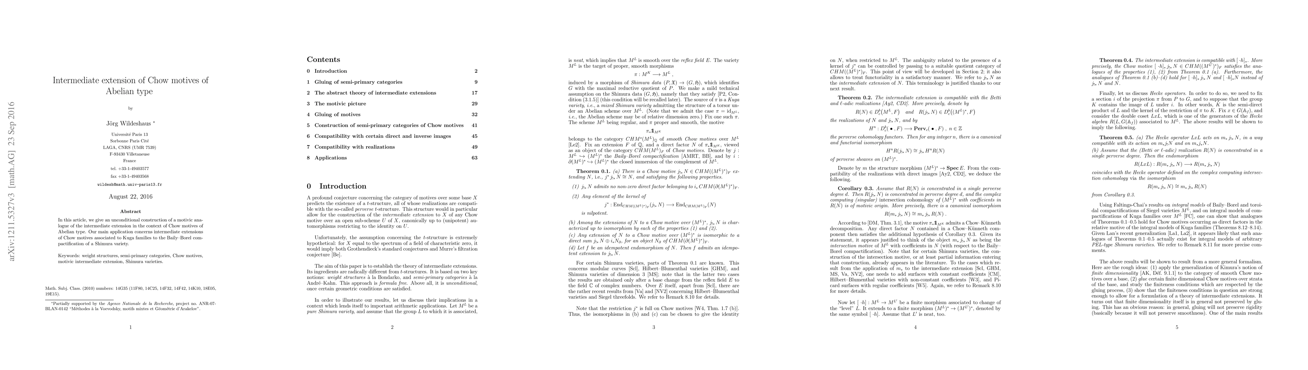Summary: This paper constructs a motivic analogue of the intermediate extension for Chow motives of Abelian type and applies it to intermediate extensions associated with Kuga families to the Baily-Borel compactification of a Shimura variety.
