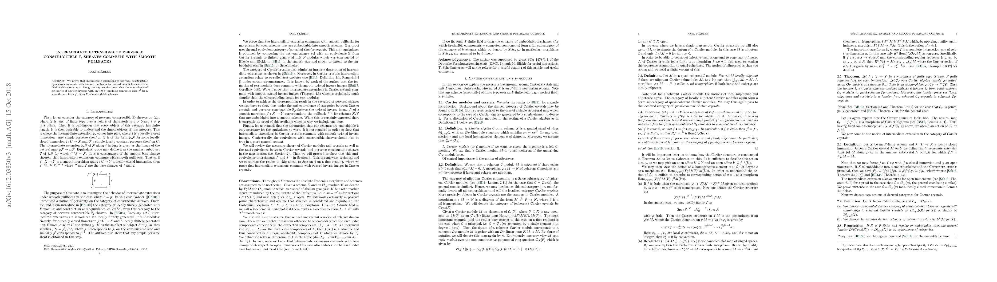 This paper proves that intermediate extensions of perverse constructible $\mathbb{F}_p$-sheaves commute with smooth pullbacks for embeddable schemes. It also demonstrates that the equivalence between Cartier crystals and $R[F]$-modules commutes with $f^!$ for smooth morphisms between such schemes.