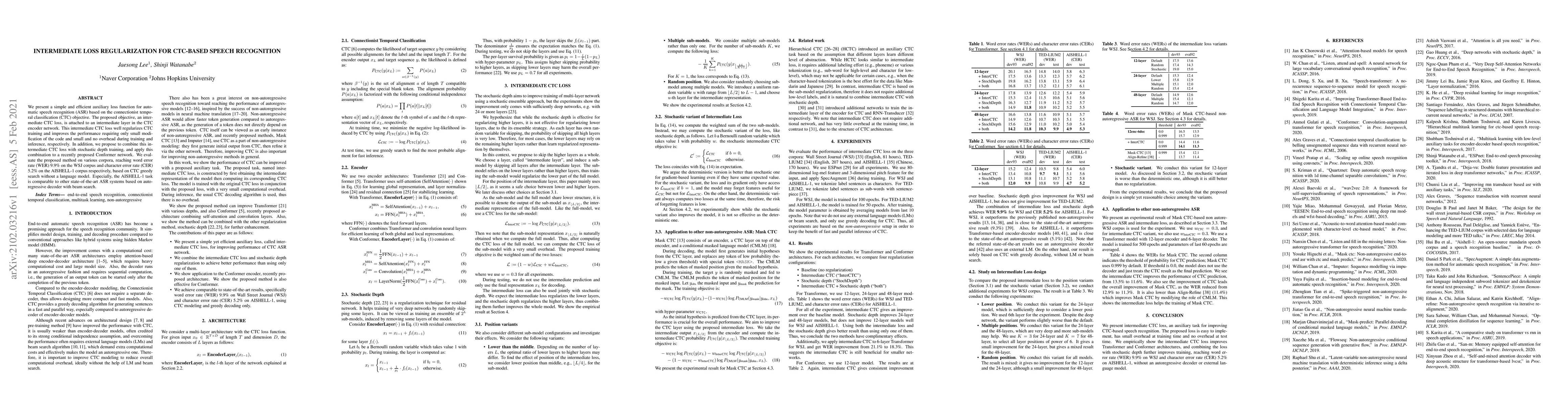 This paper introduces an intermediate CTC loss function to regularize CTC-based speech recognition, achieving improved performance with minimal code changes and overhead. Combining this loss with stochastic depth training on a Conformer network, the method achieves competitive word error rates on the WSJ corpus and character error rates on the AISHELL-1 corpus, rivaling state-of-the-art auto-regressive decoders.
