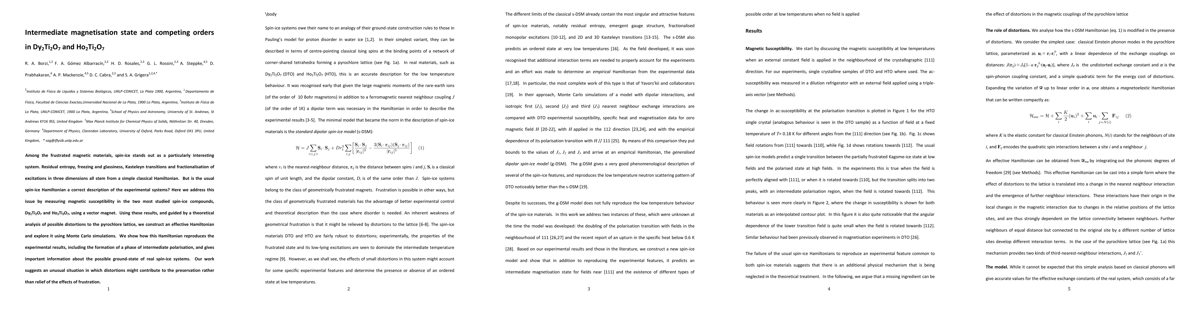 This paper investigates the intermediate magnetisation state and competing orders in Dy$_2$Ti$_2$O$_7$ and Ho$_2$Ti$_2$O$_7$ spin-ice systems through magnetic susceptibility measurements and Monte Carlo simulations. It proposes an effective Hamiltonian that reproduces experimental results and suggests that lattice distortions may enhance, rather than alleviate, frustration effects.