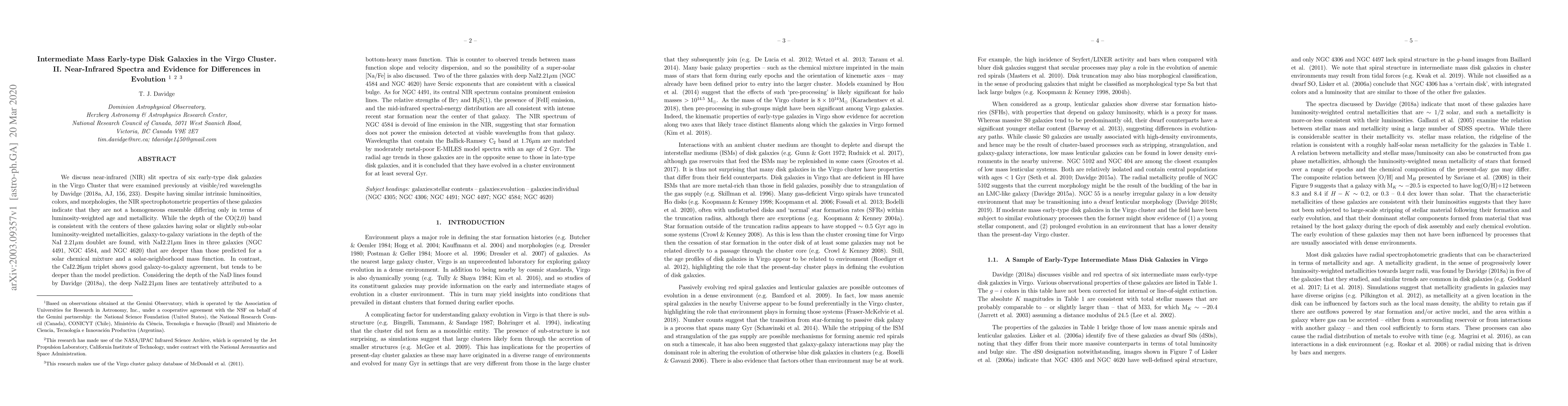 We discuss near-infrared (NIR) slit spectra of six early-type disk galaxies in the Virgo Cluster. While the depth of the CO(2,0) band is consistent with the centers of these galaxies having solar or slightly sub-solar luminosity-weighted metallicities, galaxy-to-galaxy variations in the depth of the NaI 2.21um doublet are found, with NaI2.21um lines in three galaxies (NGC 4491, NGC 4584, and NGC 4620) that are deeper than those predicted for a solar chemical mixture and a solar-neighborhood mass function. Considering the depth of the NaD lines found by Davidge (2018a), the deep NaI2.21um lines are tentatively attributed to a bottom-heavy mass function. This is counter to observed trends between mass function slope and velocity dispersion. Two of the three galaxies with deep NaI2.21um (NGC 4584 and NGC 4620) have Sersic exponents that are consistent with a classical bulge. As for NGC 4491, its central NIR spectrum contains prominent emission lines. The relative strengths of Brgamma and H_2S(1), the presence of [FeII] emission, and the mid-infrared spectral-energy distribution are all consistent with intense recent star formation near the center of that galaxy. Wavelengths that contain the Ballick-Ramsey C_2 band at 1.76um are matched by moderately metal-poor E-MILES model spectra with an age of 2 Gyr. It is concluded that these galaxies have evolved in a cluster environment for at least several Gyr.