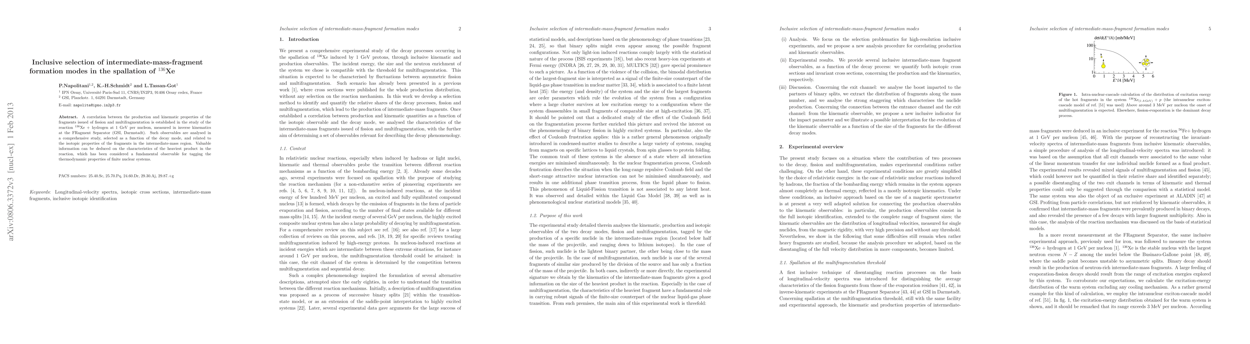 A correlation between the production and kinematic properties of the fragments issued of fission and multifragmentation is established in the study of the reaction 136Xe+hydrogen at 1 GeV per nucleon, measured in inverse kinematics at the FRagment Separator (GSI, Darmstadt). Such observables are analysed in a comprehensive study, selected as a function of the decay mode, and related to the isotopic properties of the fragments in the intermediate-mass region. Valuable information can be deduced on the characteristics of the heaviest product in the reaction, which has been considered a fundamental observable for tagging the thermodynamic properties of finite nuclear systems.