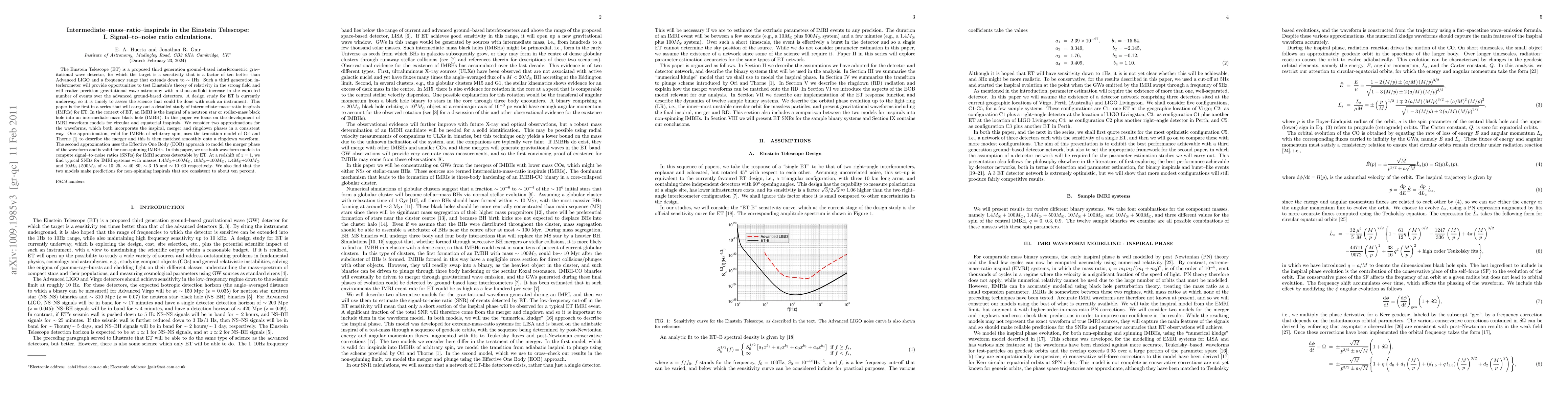 The Einstein Telescope (ET) is a proposed third generation ground-based interferometer, for which the target is a sensitivity that is a factor of ten better than Advanced LIGO and a frequency range that extends down to about 1Hz. ET will provide opportunities to test Einstein's theory of relativity in the strong field and will realize precision gravitational wave astronomy with a thousandfold increase in the expected number of events over the advanced ground-based detectors. A design study for ET is currently underway, so it is timely to assess the science that could be done with such an instrument. This paper is the first in a series that will carry out a detailed study of intermediate-mass-ratio inspirals (IMRIs) for ET. In the context of ET, an IMRI is the inspiral of a neutron star or stellar-mass black hole into an intermediate mass black hole (IMBH). In this paper we focus on the development of IMRI waveform models for circular and equatorial inspirals. We consider two approximations for the waveforms, which both incorporate the inspiral, merger and ringdown phases in a consistent way. One approximation, valid for IMBHs of arbitrary spin, uses the transition model of Ori and Thorne [1] to describe the merger, and this is then matched smoothly onto a ringdown waveform. The second approximation uses the Effective One Body (EOB) approach to model the merger phase of the waveform and is valid for non-spinning IMBHs. In this paper, we use both waveform models to compute signal-to-noise ratios (SNRs) for IMRI sources detectable by ET. At a redshift of z=1, we find typical SNRs for IMRI systems with masses 1.4+100 solar masses, 10+100 solar masses, 1.4+500 solar masses and 10+500 solar masses of about 10-25, 40-80, 3-15 and 10-60, respectively. We also find that the two models make predictions for non-spinning inspirals that are consistent to about ten percent.