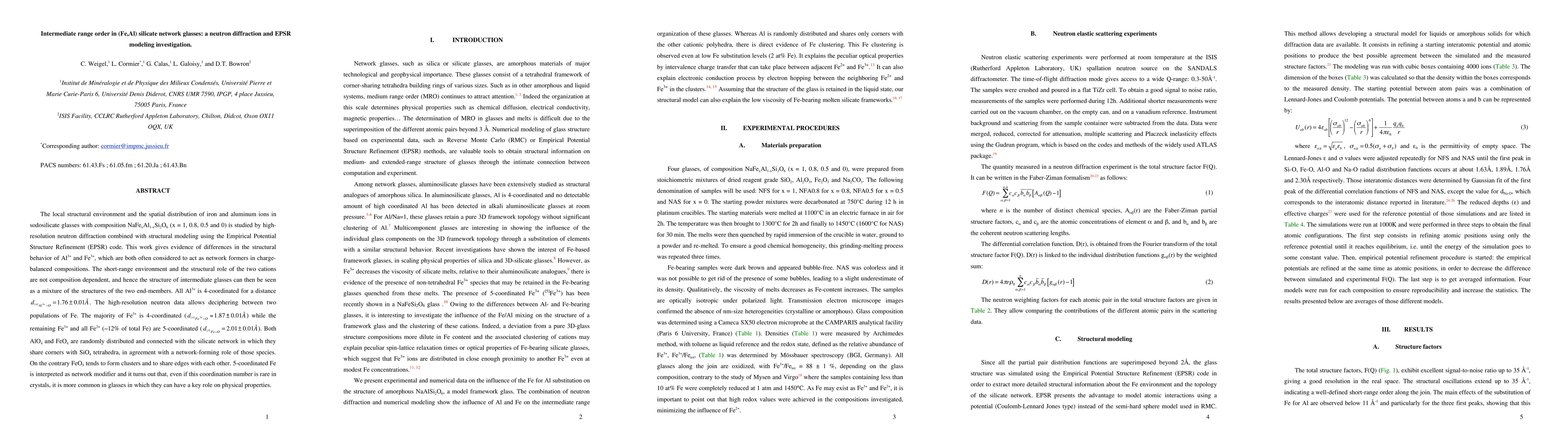 This study uses neutron diffraction and EPSR modeling to investigate the local structure of (Fe,Al) silicate glasses, revealing that Al3+ and Fe3+ both act as network formers. The majority of Fe3+ is 4-coordinated, while 5-coordinated Fe (and Fe2+) forms clusters, suggesting a network modifier role for the latter, which impacts the glasses' physical properties.