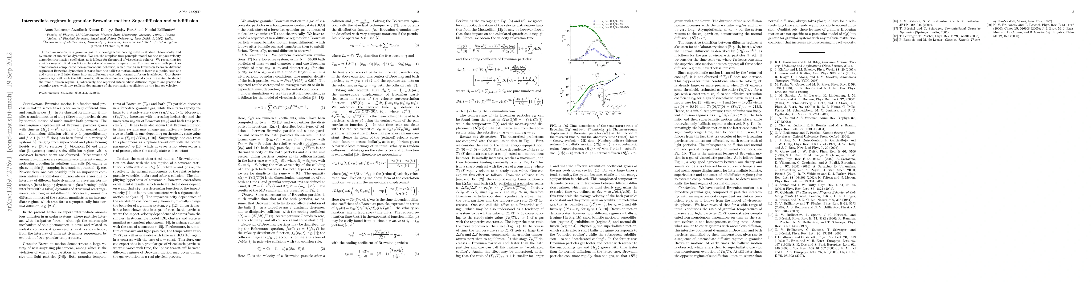 This paper investigates the complex dynamics of Brownian motion in granular gases, revealing transitions between ballistic, superballistic, and subdiffusion regimes before reaching normal diffusion. Theoretical and molecular dynamics simulations show good agreement, highlighting the generic nature of these intermediate regimes in granular systems.