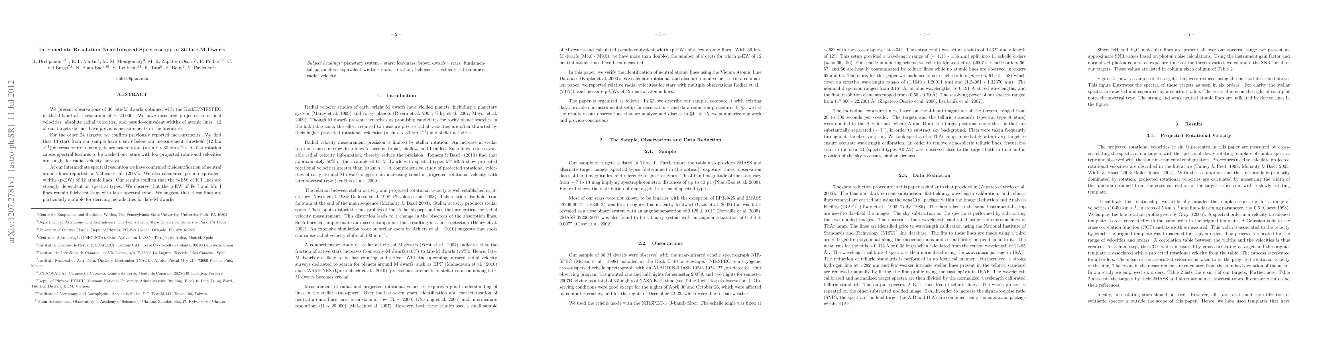 We present observations of 36 late-M dwarfs obtained with the KeckII/NIRSPEC in the J-band at a resolution of \sim20,000. We have measured projected rotational velocities, absolute radial velocities, and pseudo-equivalent widths of atomic lines. 12 of our targets did not have previous measurements in the literature. For the other 24 targets, we confirm previously reported measurements. We find that 13 stars from our sample have vsini below our measurement threshold (12 km/s) whereas four of our targets are fast rotators (vsini > 30 km/s). As fast rotation causes spectral features to be washed out, stars with low projected rotational velocities are sought for radial velocity surveys. At our intermediate spectral resolution we have confirmed the identification of neutral atomic lines reported in Mclean et al. 2007. We also calculated pseudo-equivalent widths (p-EW) of 12 atomic lines. Our results confirm that the p-EW of K I lines are strongly dependent on spectral types. We observe that the p-EW of Fe I and Mn I lines remain fairly constant with later spectral type. We suggest that those lines are particularly suitable for deriving metallicities for late-M dwarfs.