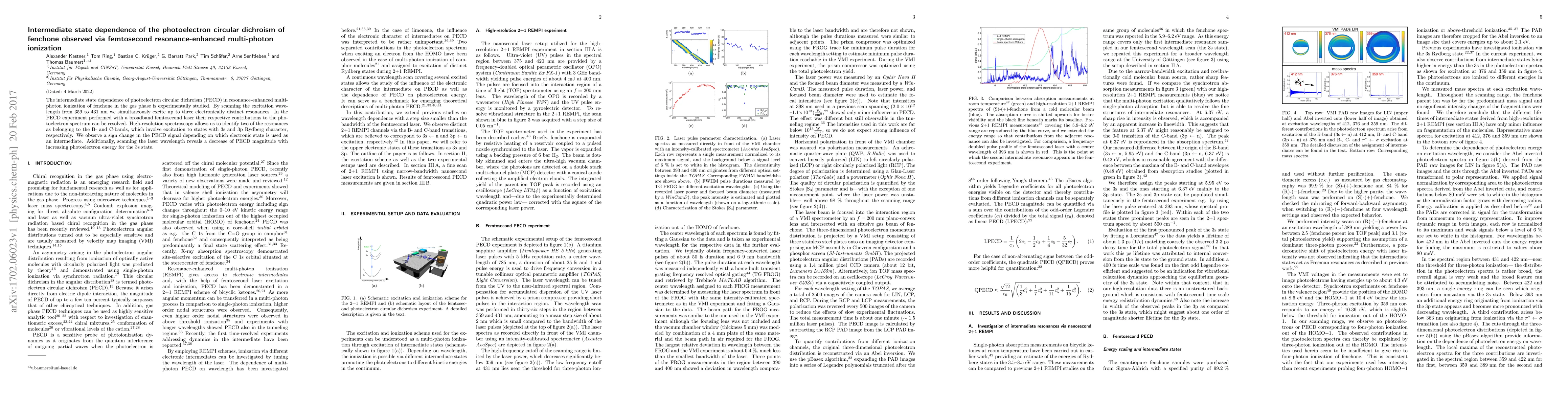This study investigates the intermediate state dependence of photoelectron circular dichroism (PECD) in fenchone via femtosecond resonance-enhanced multi-photon ionization. The experiment reveals a sign change in PECD signal based on the electronic state used as an intermediate, with a decrease in PECD magnitude observed for the 3s Rydberg state with increasing photoelectron energy.