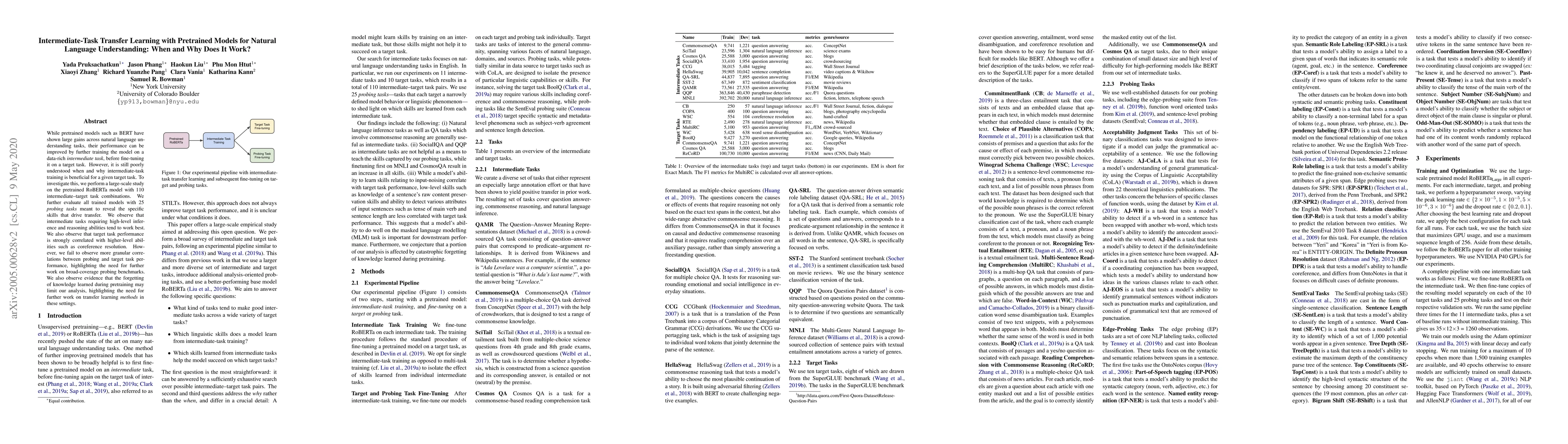 This paper investigates the effectiveness of intermediate-task transfer learning with pretrained models like RoBERTa across 110 task combinations, finding that high-level inference and reasoning tasks yield the best results. It highlights the need for further probing and transfer learning methods to address knowledge forgetting.