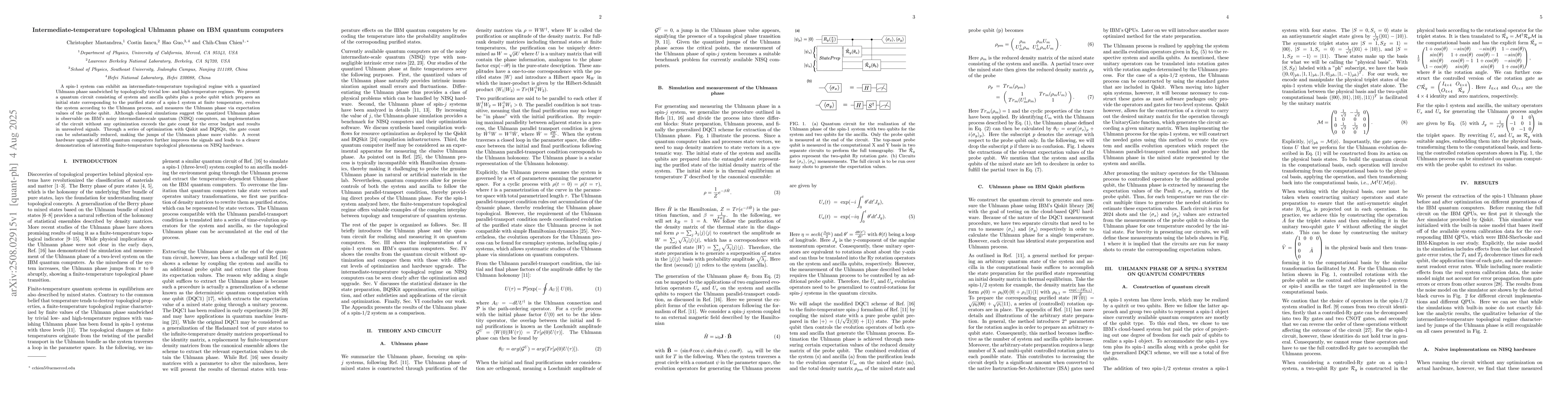 A spin-1 system can exhibit an intermediate-temperature topological regime with a quantized Uhlmann phase sandwiched by topologically trivial low- and high-temperature regimes. We present a quantum circuit consisting of system and ancilla qubits plus a probe qubit which prepares an initial state corresponding to the purified state of a spin-1 system at finite temperature, evolves the system according to the Uhlmann process, and measures the Uhlmann phase via expectation values of the probe qubit. Although classical simulations suggest the quantized Uhlmann phase is observable on IBM's noisy intermediate-scale quantum (NISQ) computers, an implementation of the circuit without any optimization exceeds the gate count for the error budget and results in unresolved signals. Through a series of optimization with Qiskit and BQSQit, the gate count can be substantially reduced, making the jumps of the Uhlmann phase more visible. A recent hardware upgrade of IBM quantum computers further improves the signals and leads to a clearer demonstration of interesting finite-temperature topological phenomena on NISQ hardware.