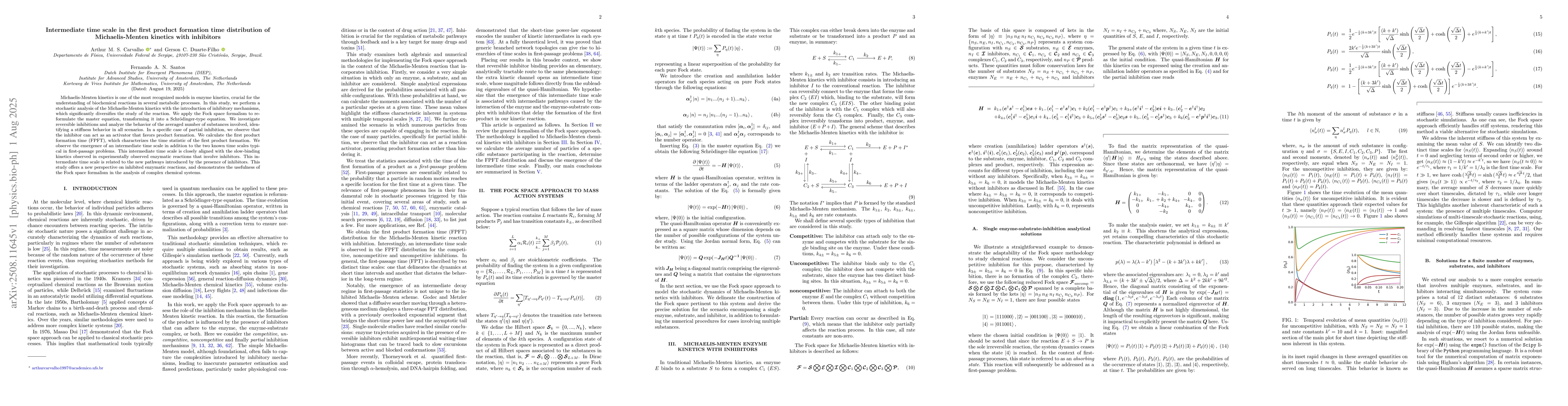 Michaelis-Menten kinetics is one of the most recognized models in enzyme kinetics, crucial for the understanding of biochemical reactions in several metabolic processes. In this study, we perform a stochastic analysis of the Michaelis-Menten kinetics with the introduction of inhibitory mechanisms, which significantly diversifies the study of the reaction. We apply the Fock space formalism to reformulate the master equation, transforming it into a Schr\"odinger-type equation. We investigate reversible inhibitions and analyze the behavior of the averaged number of substances involved, identifying a stiffness behavior in all scenarios. In a specific case of partial inhibition, we observe that the inhibitor can act as an activator that favors product formation. We calculate the first product formation time (FPFT), which characterizes the time statistic of the first product formation. We observe the emergence of an intermediate time scale in addition to the two known time scales typical in first-passage problems. This intermediate time scale is closely aligned with the slow-binding kinetics observed in experimentally observed enzymatic reactions that involve inhibitors. This intermediate time scale is related to the new pathways introduced by the presence of inhibitors. This study offers a new perspective on inhibited enzymatic reactions, and demonstrates the usefulness of the Fock space formalism in the analysis of complex chemical systems.