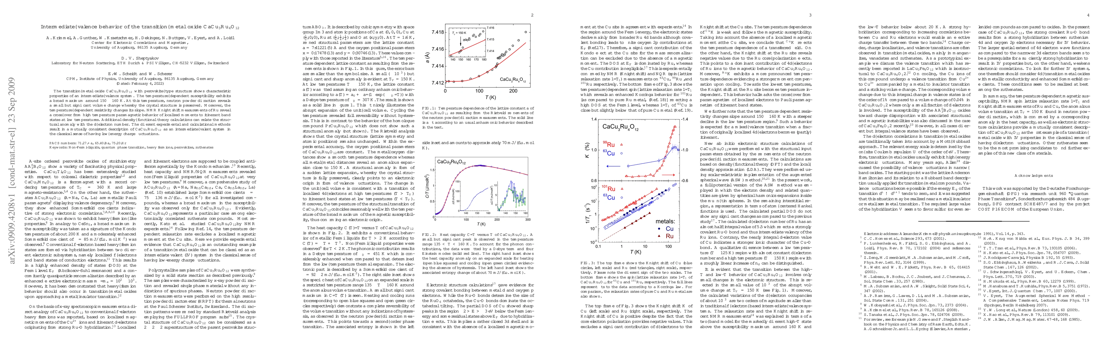The transition--metal oxide CaCu$_3$Ru$_4$O$_{12}$ with perovskite--type structure shows characteristic properties of an intermediate--valence system. The temperature--dependent susceptibility exhibits a broad maximum around $150 - 160$ K. At this temperature, neutron powder diffraction reveals a small but significant volume change whereby the crystal structure is preserved. Moreover, the temperature--dependent resistivity changes its slope. NMR Knight shift measurements of Ru reveal a cross--over from high temperature paramagnetic behavior of localized moments to itinerant band states at low temperatures. Additional density--functional theory calculations can relate the structural anomaly with the $d$--electron number. The different experimental and calculational methods result in a mutually consistent description of CaCu$_3$Ru$_4$O$_{12}$ as an intermediate--valent system in the classical sense of having low--energy charge fluctuations.