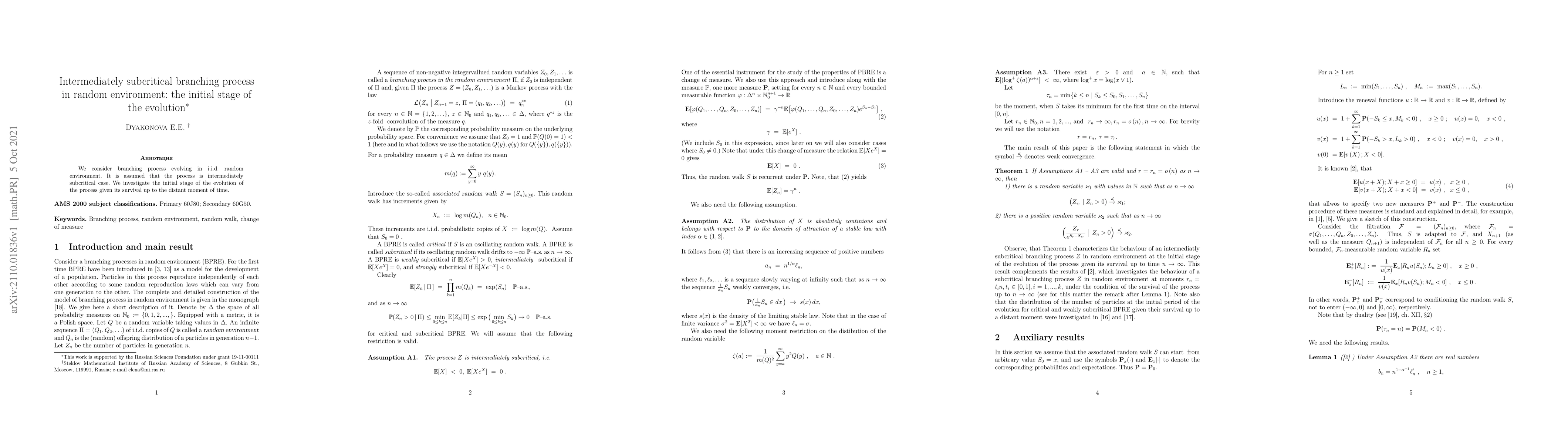 Summary: This paper examines the initial evolution stage of an intermediately subcritical branching process in an independent and identically distributed random environment, focusing on its long-term survival characteristics.