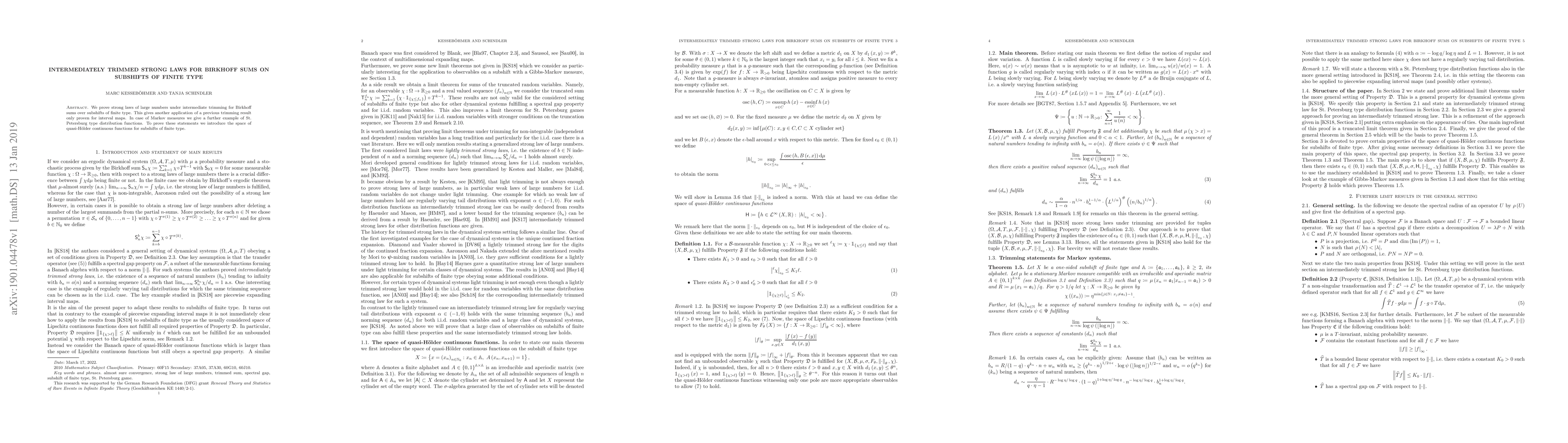 Summary: This paper proves strong laws of large numbers under intermediate trimming for Birkhoff sums on subshifts of finite type, extending previous results from interval maps. It introduces quasi-Hölder continuous functions for this purpose and provides examples of St. Petersburg type distribution functions for Markov measures.