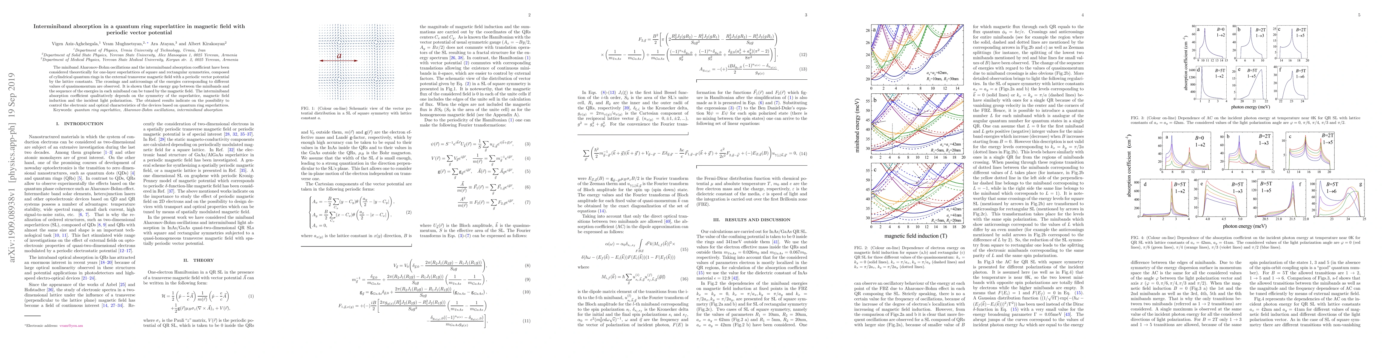 This paper theoretically investigates the miniband Aharonov-Bohm oscillations and interminiband absorption in quantum ring superlattices under a transverse magnetic field with a periodic vector potential. The study reveals that the magnetic field can tune the energy gap and energy sequence within minibands, and the interminiband absorption is influenced by the superlattice symmetry, magnetic field strength, and light polarization, suggesting potential control over electronic and optical properties of such devices.