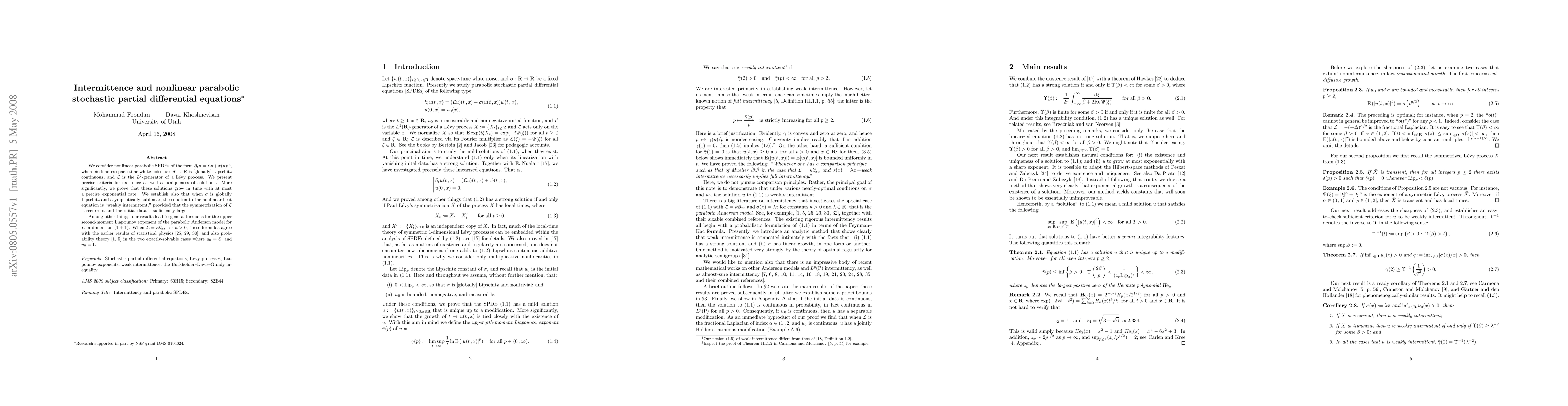 We consider nonlinear parabolic SPDEs of the form $\partial_t u=\sL u + \sigma(u)\dot w$, where $\dot w$ denotes space-time white noise, $\sigma:\R\to\R$ is [globally] Lipschitz continuous, and $\sL$ is the $L^2$-generator of a L\'evy process. We present precise criteria for existence as well as uniqueness of solutions. More significantly, we prove that these solutions grow in time with at most a precise exponential rate. We establish also that when $\sigma$ is globally Lipschitz and asymptotically sublinear, the solution to the nonlinear heat equation is ``weakly intermittent,'' provided that the symmetrization of $\sL$ is recurrent and the initial data is sufficiently large. Among other things, our results lead to general formulas for the upper second-moment Liapounov exponent of the parabolic Anderson model for $\sL$ in dimension $(1+1)$. When $\sL=\kappa\partial_{xx}$ for $\kappa>0$, these formulas agree with the earlier results of statistical physics \cite{Kardar,KrugSpohn,LL63}, and also probability theory \cite{BC,CM94} in the two exactly-solvable cases where $u_0=\delta_0$ and $u_0\equiv 1$.