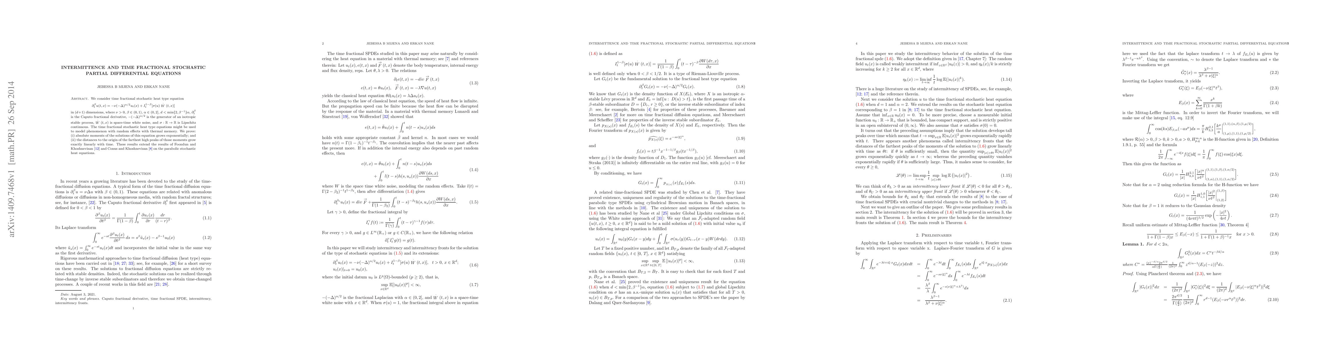 We consider time fractional stochastic heat type equation $$\partial^\beta_tu(t,x)=-\nu(-\Delta)^{\alpha/2} u_t(x)+I^{1-\beta}_t[\sigma(u)\stackrel{\cdot}{W}(t,x)]$$ in $(d+1)$ dimensions, where $\nu>0$, $\beta\in (0,1)$, $\alpha\in (0,2]$, $d<\min\{2,\beta^{-1}\}\a$, $\partial^\beta_t$ is the Caputo fractional derivative, $-(-\Delta)^{\alpha/2} $ is the generator of an isotropic stable process, $\stackrel{\cdot}{W}(t,x)$ is space-time white noise, and $\sigma:\RR{R}\to\RR{R}$ is Lipschitz continuous. The time fractional stochastic heat type equations might be used to model phenomenon with random effects with thermal memory. We prove: (i) absolute moments of the solutions of this equation grows exponentially; and (ii) the distances to the origin of the farthest high peaks of those moments grow exactly linearly with time. These results extend the results of Foondun and Khoshnevisan \cite{foondun-khoshnevisan-09} %(Mohammud Foondun and Davar Khoshnevisan, Intermittence and nonlinear parabolic %stochastic partial differential equations, Electron. J. Probab. 14 (2009), no. 21, 548--568) and Conus and Khoshnevisan \cite{conus-khoshnevisan} % (On the existence and position of the farthest peaks of a family of stochastic %heat and wave equations, Probab. Theory Related Fields 152 (2012), no. 3-4, 681--701) on the parabolic stochastic heat equations.