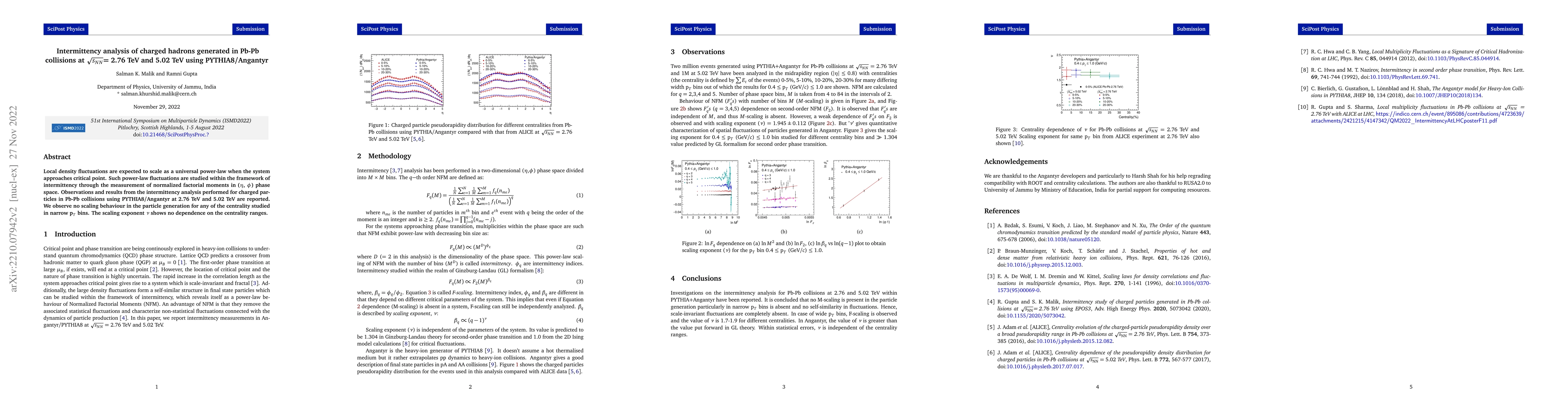 This study investigates intermittency in charged hadrons from Pb-Pb collisions using PYTHIA8/Angantyr at 2.76 TeV and 5.02 TeV, finding no evidence of scaling behavior in local density fluctuations as predicted by critical point theories. The scaling exponent $\nu$ remains constant across different centrality ranges.