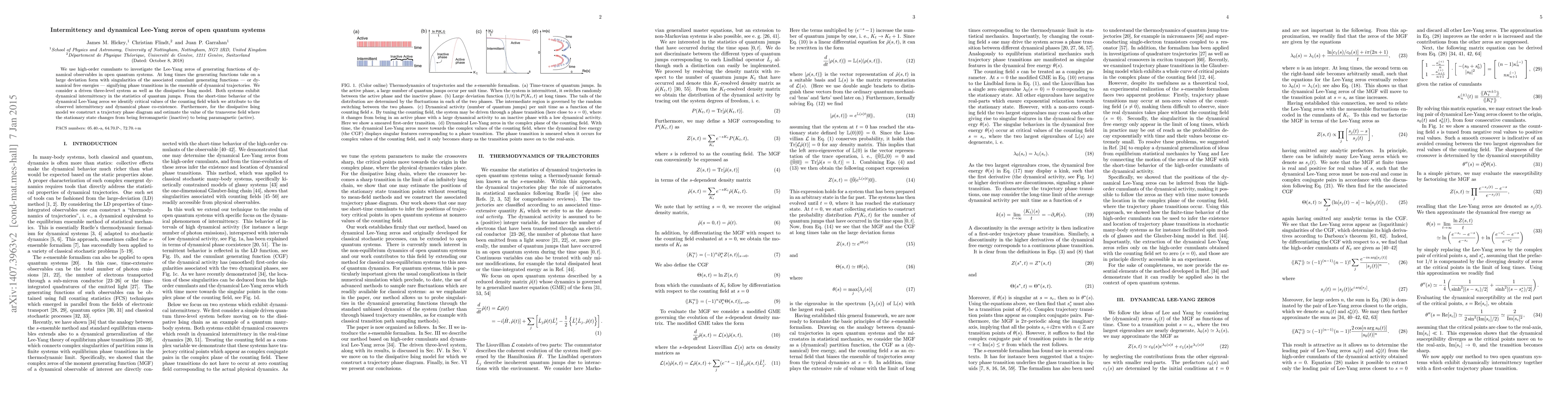 This paper investigates the Lee-Yang zeros in open quantum systems' generating functions, revealing singularities that indicate phase transitions and intermittency in quantum jumps. It analyzes driven three-level systems and the dissipative Ising model, identifying critical values linked to observed intermittency and constructing a phase diagram for the Ising model to estimate the transition field from ferromagnetic to paramagnetic states.