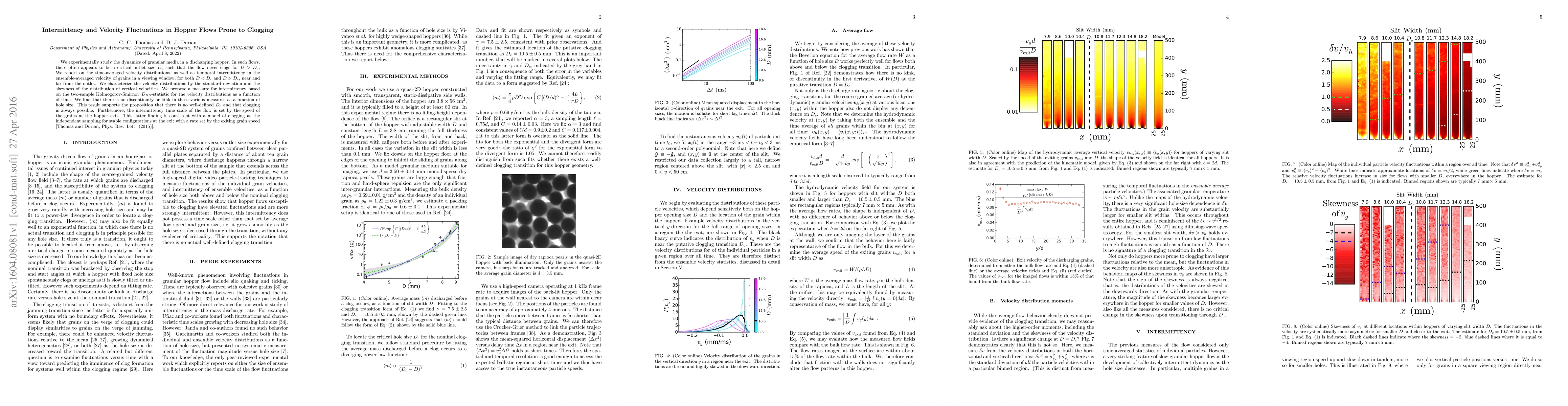 This paper experimentally investigates granular flow dynamics in hoppers, finding no clear critical outlet size $D_c$ for clogging prevention. It characterizes velocity fluctuations and intermittency using standard deviation, skewness, and a $D_{KS}$-statistic, concluding that clogging is always possible and that intermittency is governed by the grain speed at the exit.