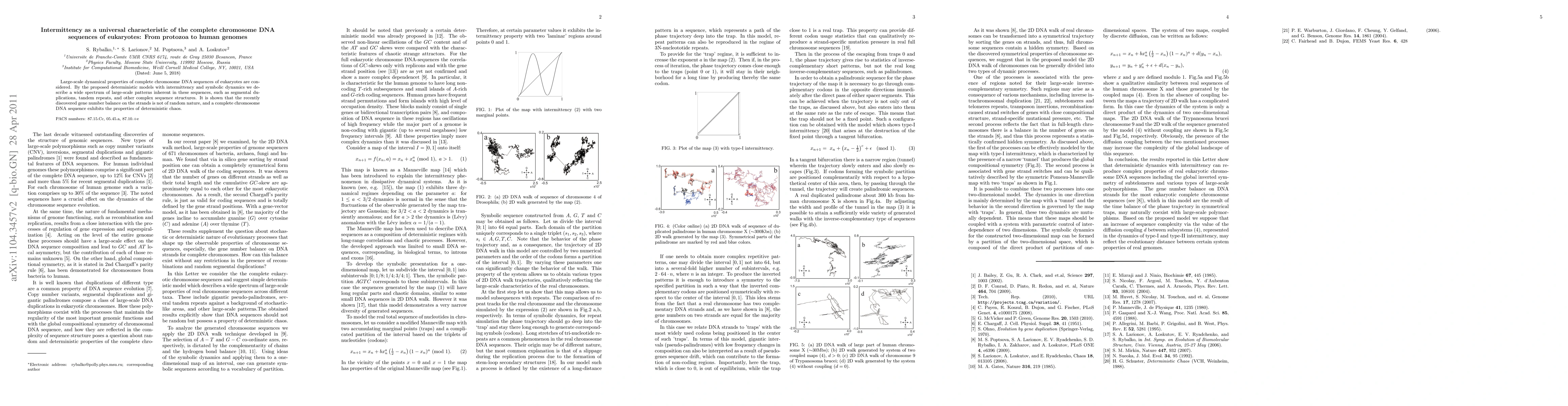 Large-scale dynamical properties of complete chromosome DNA sequences of eukaryotes are considered. By the proposed deterministic models with intermittency and symbolic dynamics we describe a wide spectrum of large-scale patterns inherent in these sequences, such as segmental duplications, tandem repeats, and other complex sequence structures. It is shown that the recently discovered gene number balance on the strands is not of random nature, and a complete chromosome DNA sequence exhibits the properties of deterministic chaos.