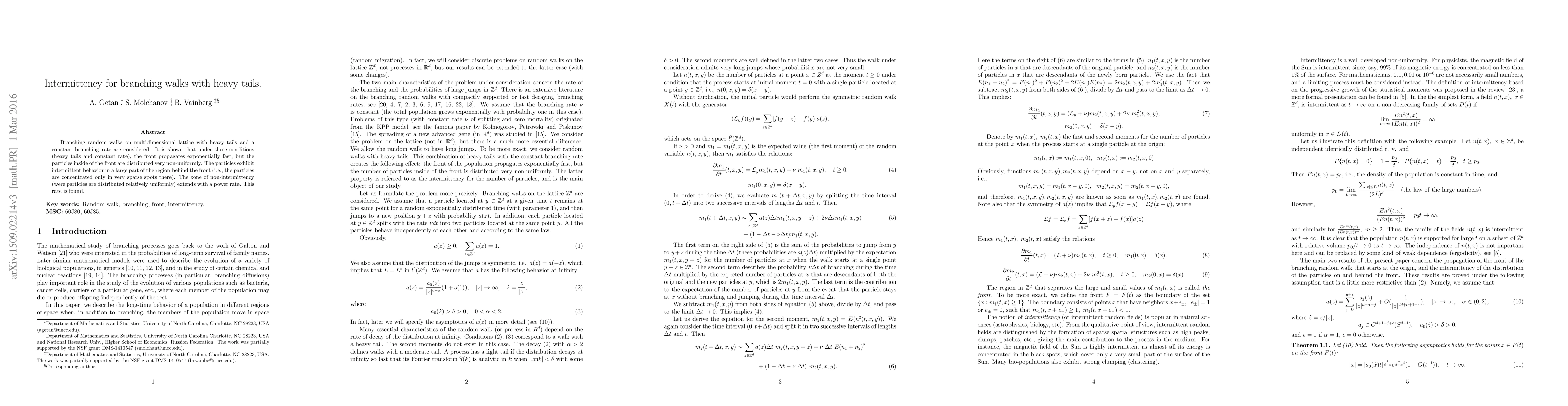 Branching random walks on multidimensional lattice with heavy tails and a constant branching rate are considered. It is shown that under these conditions (heavy tails and constant rate), the front propagates exponentially fast, but the particles inside of the front are distributed very non-uniformly. The particles exhibit intermittent behavior in a large part of the region behind the front (i.e., the particles are concentrated only in very sparse spots there). The zone of non-intermittency (were particles are distributed relatively uniformly) extends with a power rate. This rate is found.