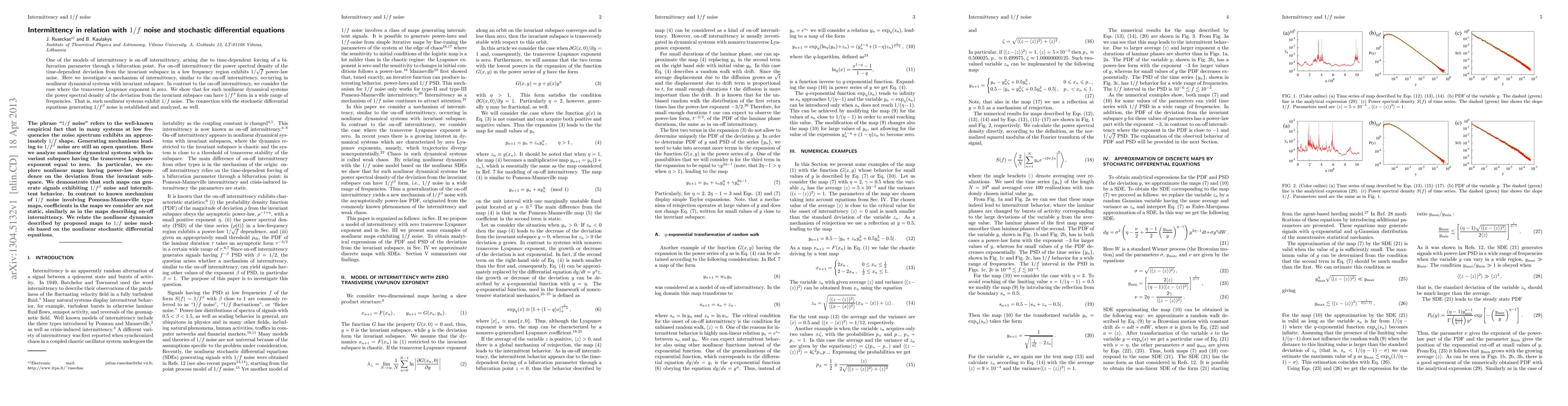 This paper explores intermittency in nonlinear dynamical systems, focusing on a mechanism similar to on-off intermittency but with a zero transverse Lyapunov exponent. It demonstrates that such systems exhibit 1/f^β noise, linking this behavior to stochastic differential equations generating 1/f^β noise.