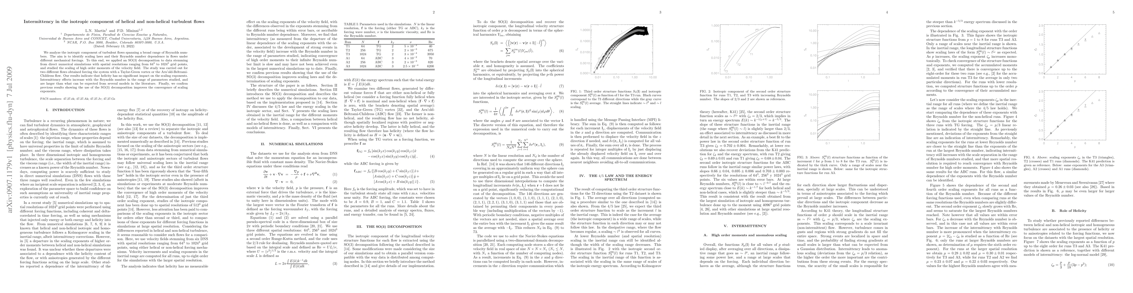 We analyze the isotropic component of turbulent flows spanning a broad range of Reynolds numbers. The aim is to identify scaling laws and their Reynolds number dependence in flows under different mechanical forcings. To this end, we applied an SO(3) decomposition to data stemming from direct numerical simulations with spatial resolutions ranging from 64^3 to 1024^3 grid points, and studied the scaling of high order moments of the velocity field. The study was carried out for two different flows obtained forcing the system with a Taylor-Green vortex or the Arn'old-Beltrami-Childress flow. Our results indicate that helicity has no significant impact on the scaling exponents. Intermittency effects increase with the Reynolds number in the range of parameters studied, and are larger than what can be expected from several models in the literature. Finally, we confirm previous results showing the use of the SO(3) decomposition improves the convergence of scaling exponents.