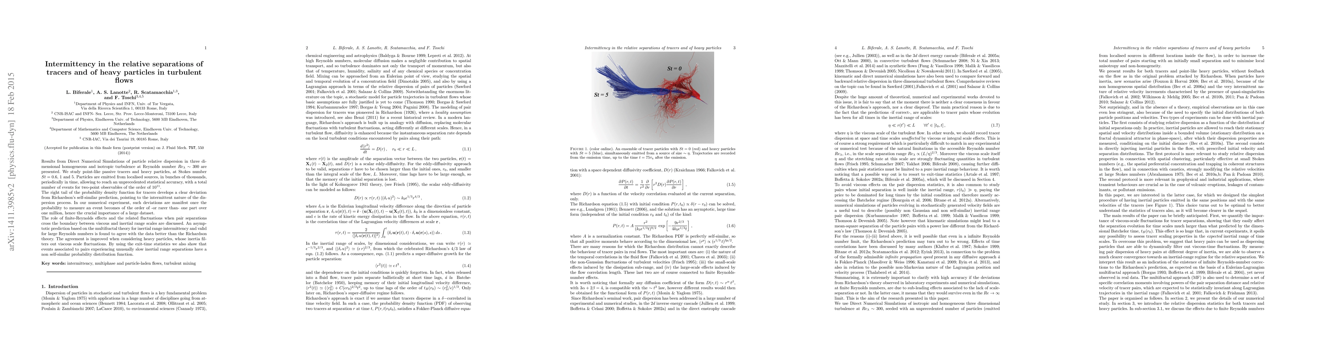 Results from Direct Numerical Simulations of particle relative dispersion in three dimensional homogeneous and isotropic turbulence at Reynolds number $Re_\lambda \sim 300$ are presented. We study point-like passive tracers and heavy particles, at Stokes number St = 0, 0.6, 1 and 5. Particles are emitted from localised sources, in bunches of thousands, periodically in time, allowing to reach an unprecedented statistical accuracy, with a total number of events for two-point observables of the order of $10^{11}$. The right tail of the probability density function for tracers develops a clear deviation from Richardson's self-similar prediction, pointing to the intermittent nature of the dispersion process. In our numerical experiment, such deviations are manifest once the probability to measure an event becomes of the order of -or rarer than- one part over one million, hence the crucial importance of a large dataset. The role of finite-Reynolds effects and the related fluctuations when pair separations cross the boundary between viscous and inertial range scales are discussed. An asymptotic prediction based on the multifractal theory for inertial range intermittency and valid for large Reynolds numbers is found to agree with the data better than the Richardson theory. The agreement is improved when considering heavy particles, whose inertia filters out viscous scale fluctuations. By using the exit-time statistics we also show that events associated to pairs experiencing unusually slow inertial range separations have a non self-similar probability distribution function.