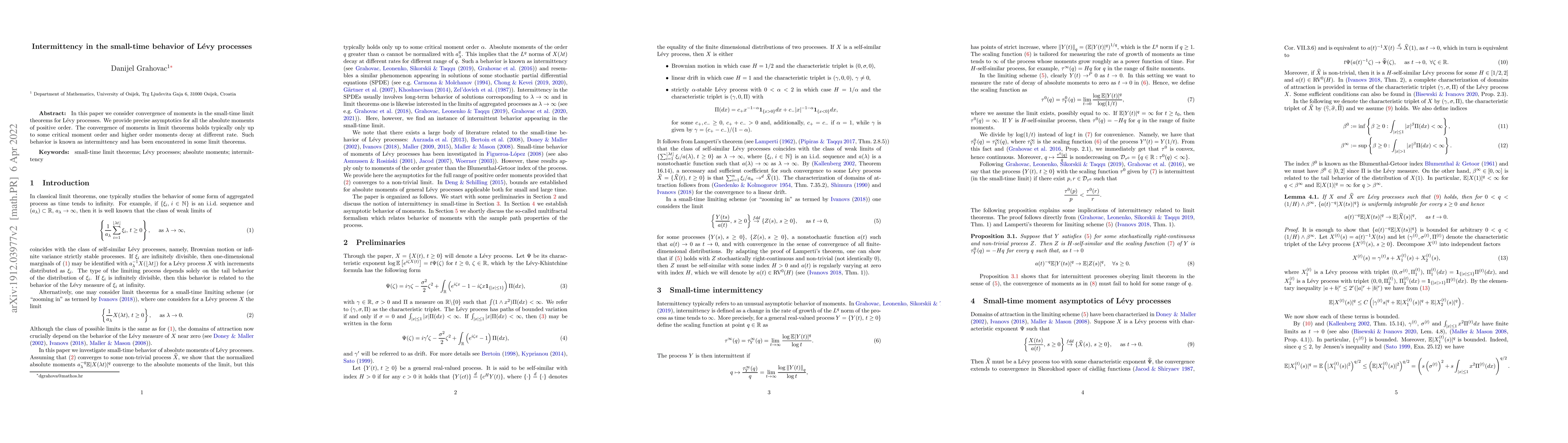 This paper investigates the convergence of moments in small-time limit theorems for Lévy processes, providing precise asymptotics for absolute moments. It reveals intermittency, where higher order moments decay at different rates, a phenomenon observed in certain limit theorems.