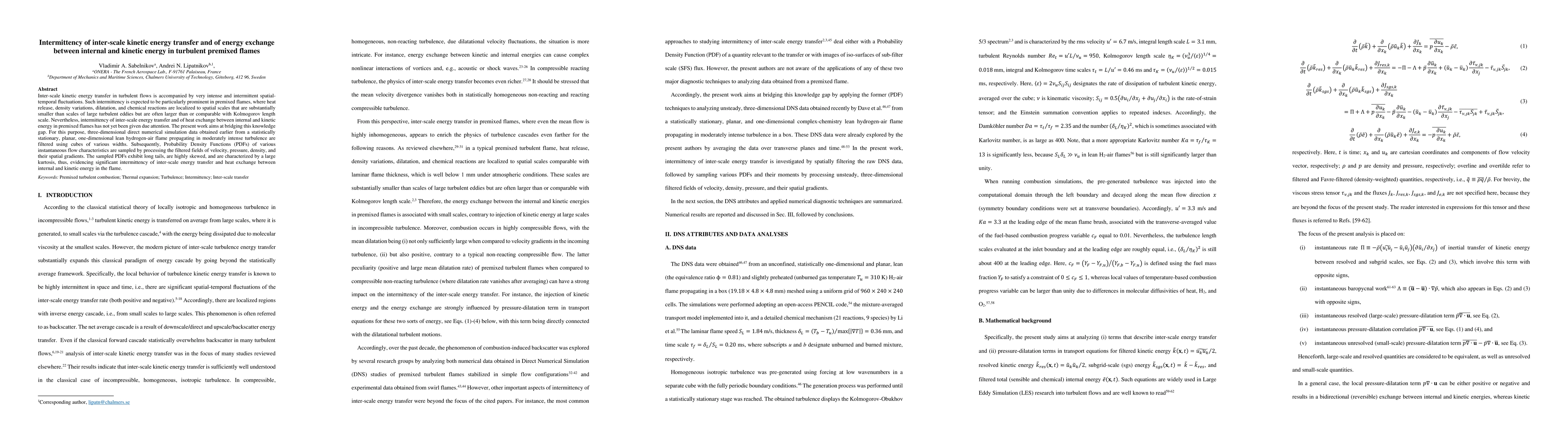 Inter-scale kinetic energy transfer in turbulent flows is accompanied by very intense and intermittent spatial-temporal fluctuations. Such intermittency is expected to be particularly prominent in premixed flames, where heat release, density variations, dilatation, and chemical reactions are localized to spatial scales that are substantially smaller than scales of large turbulent eddies but are often larger than or comparable with Kolmogorov length scale. Nevertheless, intermittency of inter-scale energy transfer and of heat exchange between internal and kinetic energy in premixed flames has not yet been given due attention. The present work aims at bridging this knowledge gap. For this purpose, three-dimensional direct numerical simulation data obtained earlier from a statistically stationary, planar, one-dimensional lean hydrogen-air flame propagating in moderately intense turbulence are filtered using cubes of various widths. Subsequently, Probability Density Functions (PDFs) of various instantaneous flow characteristics are sampled by processing the filtered fields of velocity, pressure, density, and their spatial gradients. The sampled PDFs exhibit long tails, are highly skewed, and are characterized by a large kurtosis, thus, evidencing significant intermittency of inter-scale energy transfer and heat exchange between internal and kinetic energy in the flame.