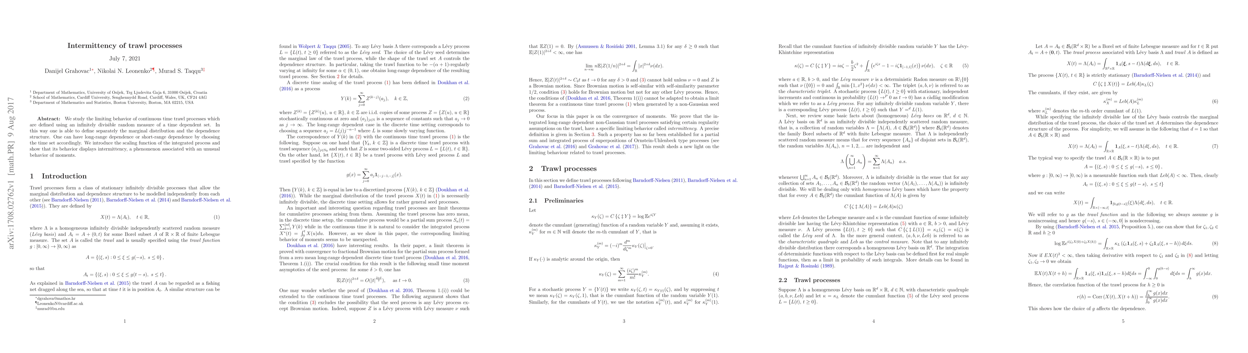 This paper studies trawl processes with intermittent behavior, which displays unusual patterns of moments due to long-range dependence. It introduces a scaling function to analyze this phenomenon and shows its connection to the limiting behavior of continuous time trawl processes.