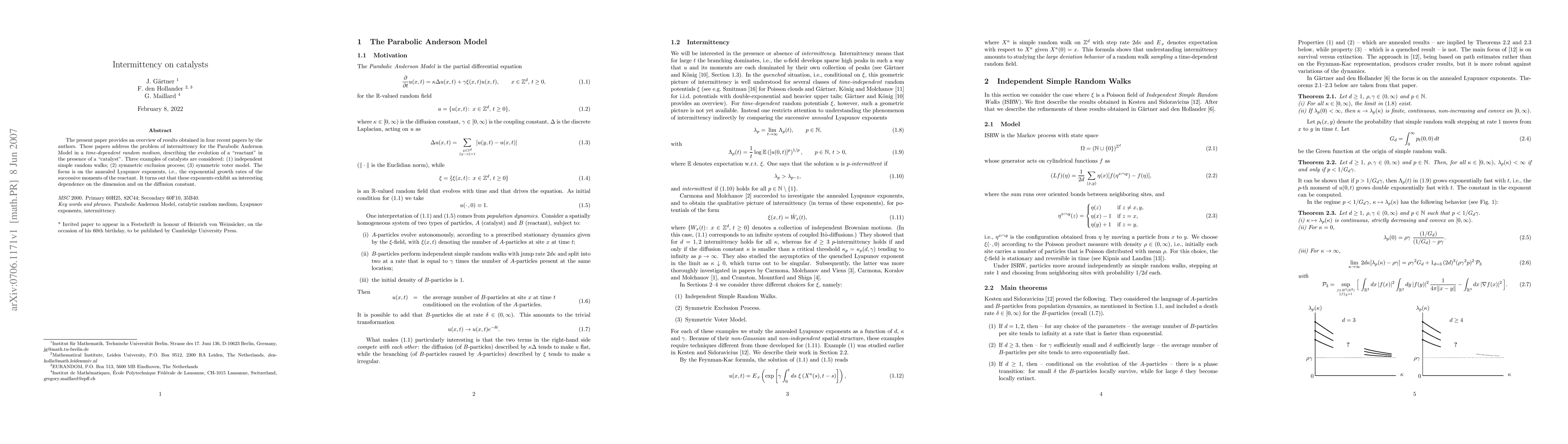 The present paper provides an overview of results obtained in four recent papers by the authors. These papers address the problem of intermittency for the Parabolic Anderson Model in a \emph{time-dependent random medium}, describing the evolution of a ``reactant'' in the presence of a ``catalyst''. Three examples of catalysts are considered: (1) independent simple random walks; (2) symmetric exclusion process; (3) symmetric voter model. The focus is on the annealed Lyapunov exponents, i.e., the exponential growth rates of the successive moments of the reactant. It turns out that these exponents exhibit an interesting dependence on the dimension and on the diffusion constant.
