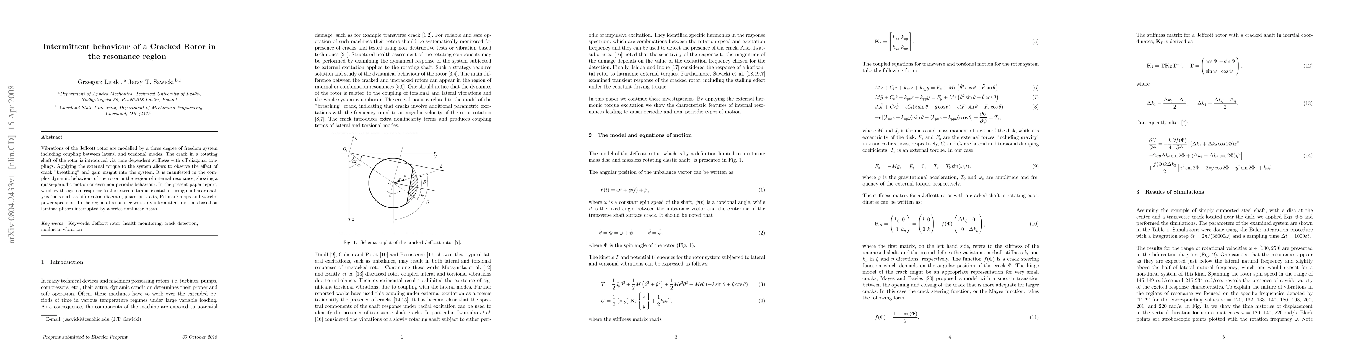 Vibrations of the Jeffcott rotor are modelled by a three degree of freedom system including coupling between lateral and torsional modes. The crack in a rotating shaft of the rotor is introduced via time dependent stiffness with off diagonal couplings. Applying the external torque to the system allows to observe the effect of crack "breathing" and gain insight into the system. It is manifested in the complex dynamic behaviour of the rotor in the region of internal resonance, showing a quasi--periodic motion or even non-periodic behaviour. In the present paper report, we show the system response to the external torque excitation using nonlinear analysis tools such as bifurcation diagram, phase portraits, Poincare maps and wavelet power spectrum. In the region of resonance we study intermittent motions based on laminar phases interrupted by a series nonlinear beats.