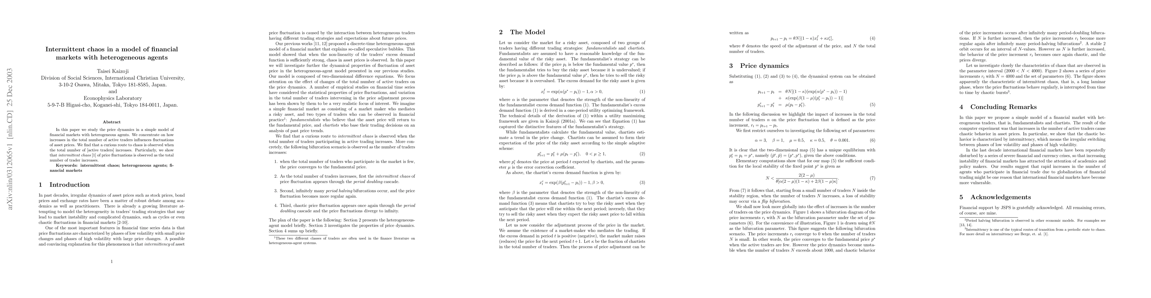 In this paper we study the price dynamics in a simple model of financial markets with heterogeneous agents. We concentrate on how increases in the total number of active traders influences fluctuations of asset prices. We find that a curious route to chaos is observed when the total number of [active traders] increases. Particularly, we show that {\it intermittent chaos} [1] of price fluctuations is observed as the total number of trader increases.