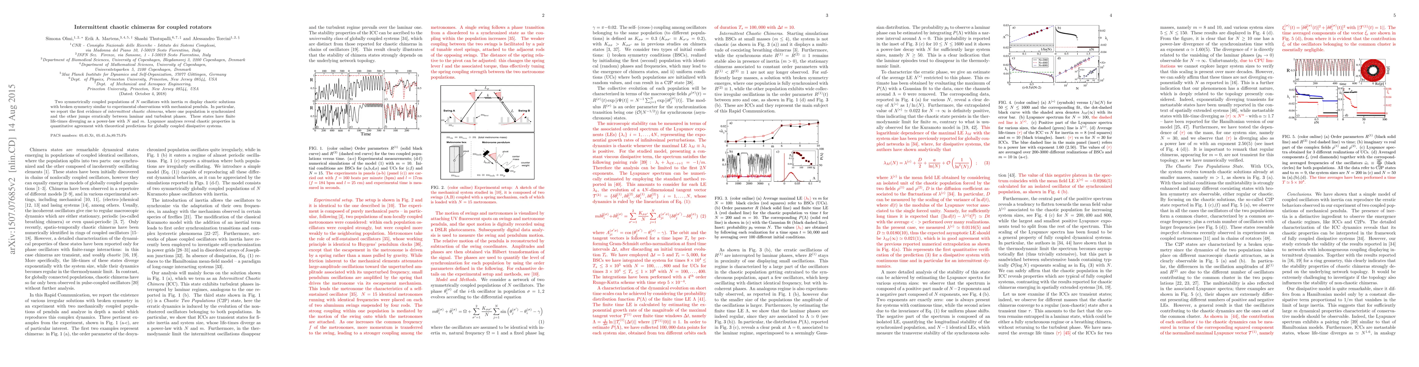 This paper investigates coupled populations of oscillators displaying intermittent chaotic chimeras, where one group synchronizes while the other oscillates chaotically between stable and turbulent phases. The findings align with theoretical predictions for globally coupled dissipative systems, as evidenced by Lyapunov analysis.