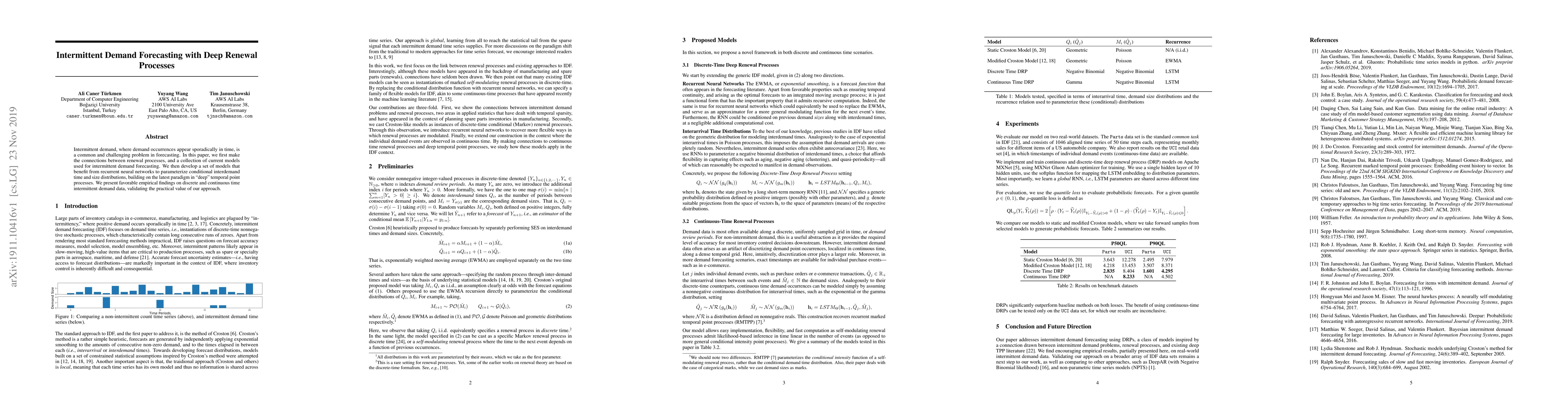 This paper connects intermittent demand forecasting to renewal processes and proposes deep learning models using recurrent neural networks to parameterize interdemand time and size distributions, achieving favorable empirical results on both discrete and continuous time data.